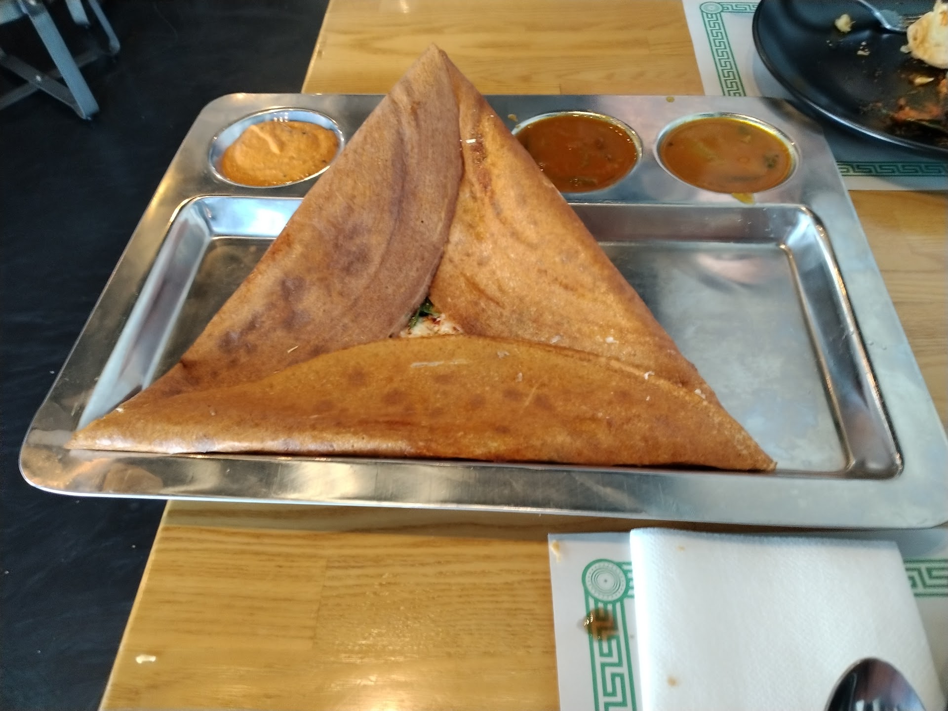 For the rest of you: We arrived at 5:30 and were seated immediately. Our server brought us menus and water. We do tend to throw servers off, as we always order a whole buffet for the two of us, so we'll forgive her for that confusion. We started with the Ugadi special dosa, samosa, and pakora. The dosa was absolutely delicious. The taste of the dosa, which is filled with pretty much every thing, was delicious. It also comes with 2 sauces and another that seems like pickled curry? I didn't ask about it, but we used it very happily for the pakora as well. The samosa was hot and the right amount of crisp on the outside and creamy on the inside. The pakora was legit the largest order of pakora I've seen, and both the mint and the tamarind sauces were amazing. The pakora was elevated by whatever that pickled curry flavored juice was from the dosa plate. We also ordered a Desi salad which was a nice fresh bowl to have on the table. For the main, we ordered chicken saag and novratan korma with garlic naan. We asked for a level 4 because we both LOVE hot food. My brother tells me I eat lava. We are regular orderers of 3-4 at most restaurants, but the server told us we should get a 3 because it was very very spicy. We said okay and went with her suggestion. This is where my unfortunately comes in. Unfortunately, the level 3 felt and tasted like a level 0 or 1, honestly. I've read people say this place serves hot food, and I think they must have adjusted their spice level for the hotel corridor and based on community response. What I will say was that the flavor of the level 0-1 was amazing. It tasted wonderful, but we had wanted that heat that was missing. Lane ate her meal with the hot peppers from the Desi salad 𤣠The naan was, in a word, disappointing. It felt like the naan you buy from Kroger. Thick and soft and the garlic was not poppin like expected. It was even a little dry for naan. But that's okay. You can't hit everything out of the park every time. We'll definitely be back, but we will ask for a true 4 next time and hope that what we received tonight was not actually a true 3... Because then we might need a 7 š¤£š¤£š¤£ Up side: the fact that we didn't get water refills was fine since the food wasn't spicy! Speed comment: this food comes out FAST. We watched other tables after we'd finished eating. All of it came out fast and at the right temp!
