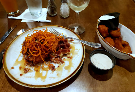 Had an 8 oz. filet (delicious, cooked as ordered, thick, tender - distinctive flavor - perhaps due to small farm sourcing, tastes may very but I loved it), fried broccoli (my least fav, but that's probably because I ate every bite of everything else and veggies are last on my list), steak fries (large, meaty, crispy outside, cooked perfectly awesome as were the normal sized sweet potato fries), pecan crusted trout (huge portion - crispy thin crust of crushed pecans on top of perfectly cooked trout - no fishy taste or smell at all - superb!) a Bloody Mary (their own concoction with a powdered rim and lime wedge - you don't eat this one you drink it - more fresh tomato taste than any mix I've had, very nice) a specialty drink my wife loved but a sip was plenty for me... and a small (so it seemed at first) wedge of a very rich, thick, creamy-like-brie cheesecake that melted in your mouth with a few dollaps of the most wonderful whipped cream I've had in a long time. When they set it down I was disappointed. After I ate it I was in awe. And stuffed. After a few bites, I wanted to take half home but I couldn't stop eating it...