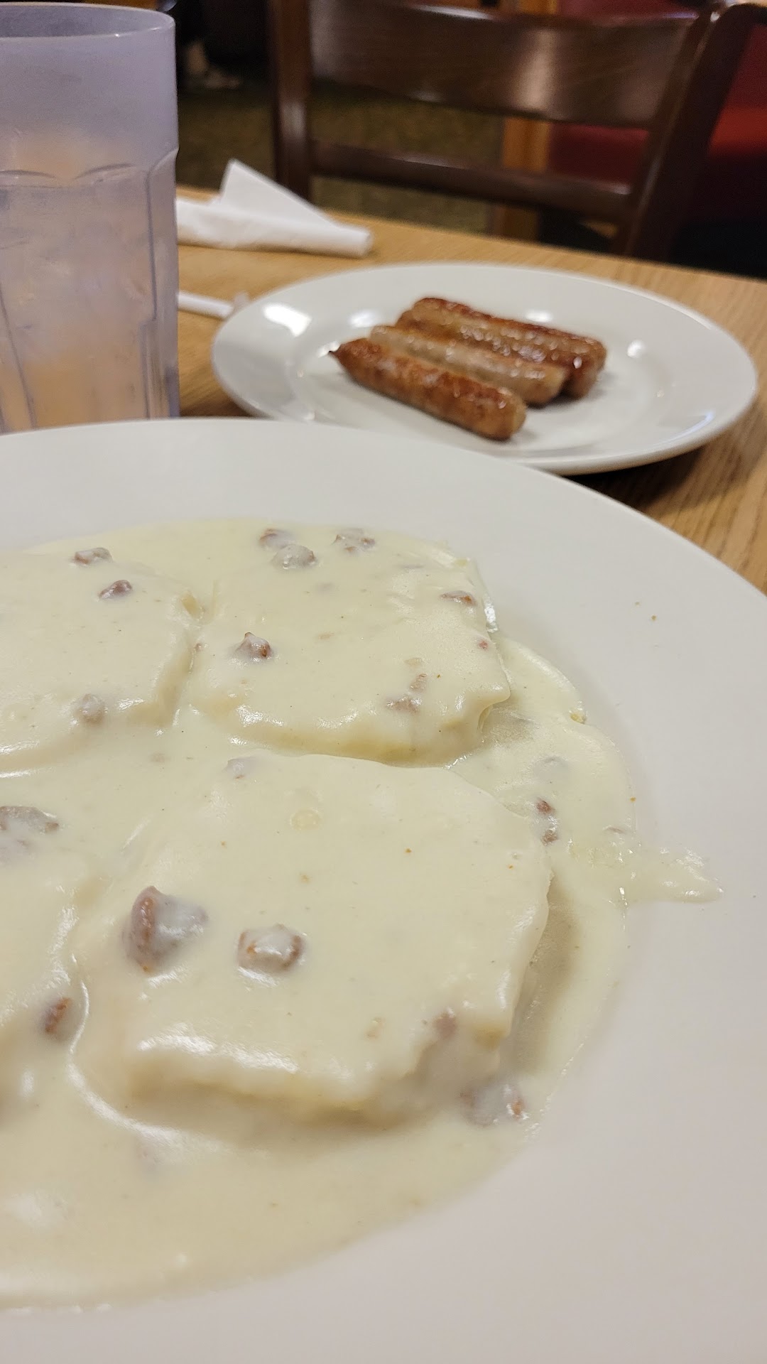 The flavor and texture of the biscuits were fantastic. They were soft, tender, and delicious. The sausage that I ordered on the side had good flavor. The gravy texture was smooth as could be. That's the end of the goodness. The gravy tasted like flour and skim milk. No amount of salt and pepper could save it.