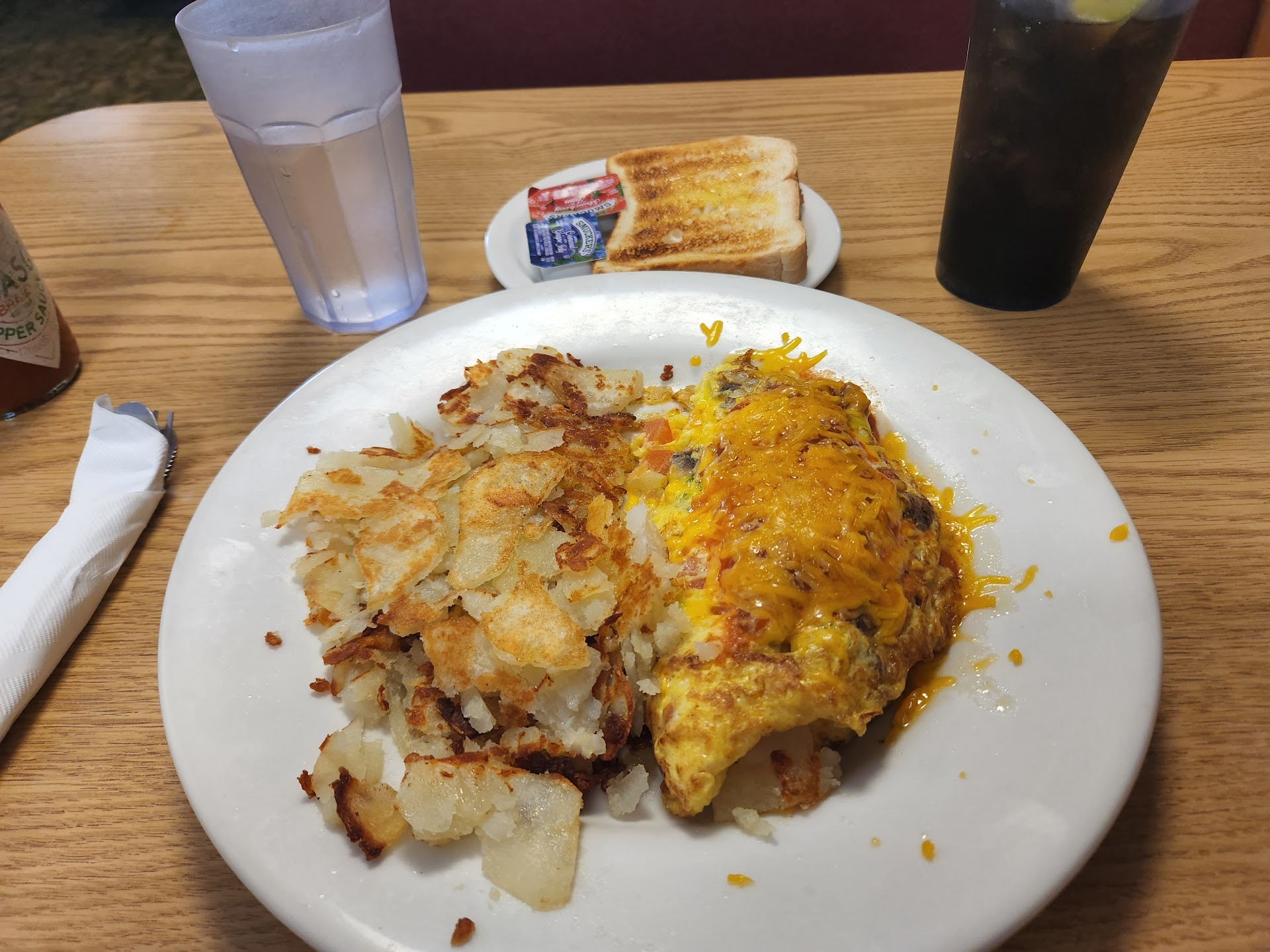 We ordered french toast with a side of bacon and biscuits and gravy with a side of sausage. When I asked if the b&g came with any meat I was told no. So instead of ordering some eggs I ordered sausage on the side. Turns out the gravy does have sausage in it.