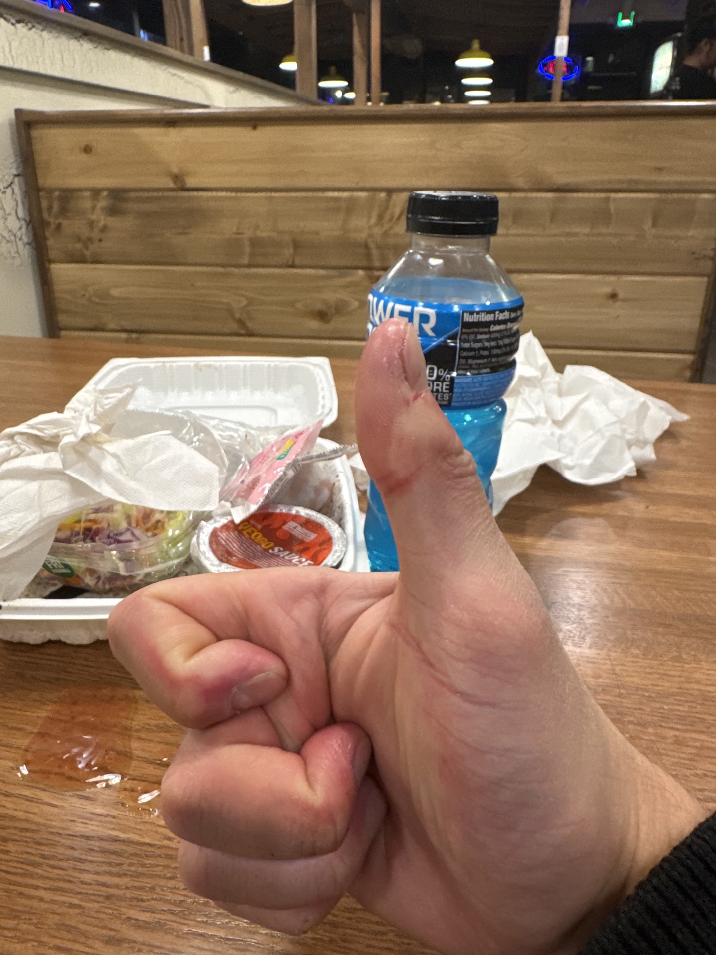 This new store in Murray is... Wow. So bad. I wish I could say they have zero customer service skills. Sadly, it is far below zero. Not a single smile. Not a single friendliness atmosphere. Very dirty store. The place was absolutely disgusting. While waiting for food (they were 10 minutes late on my order) I stood next to the pickup shelf. I couldn't stop staring at all the food and trashes on the floor in the drive through area between the kitchen door. There was a massive gunk (meat maybe?) on the floor and bunch of foods all over. The guy eventually swept, finally but not that big gunk of meat. It was so gross. The place isn't clean at all. They overdid the advertisement with their bottles (literally blocking the entire window at the serving counter). I guess with the hot meat and such... The bottles are greasy.