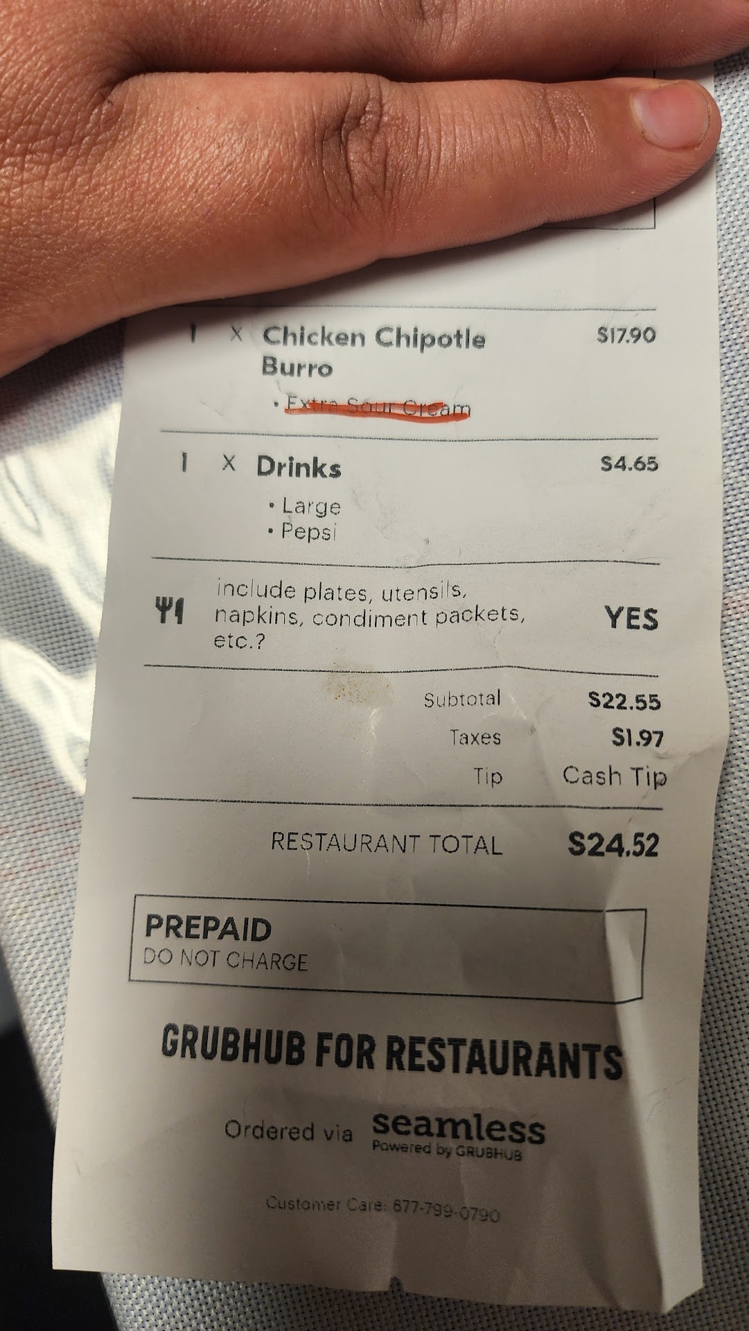 Read moreIf a customer can get their food HOT WITH HEAT the majority of the time they will not complain about their experience EVEN if it didn’t taste that good… This place has went way down hill when it comes to get getting fresh / hot foods, even when you eat it there or outside in your vehicle…It’s sad that the owner is letting this place do so bad when it comes to the bad quality of their foods…The reviews seem to be the same, one would think you would try and fix the problems… It’s March 26 2022 at 9:30 pm walk in the store all chairs are upside down on tables as if you don’t want the customers to sit down and eat, you don’t close until 11 pm, you only have one of your sauces on the cold line, you can see where the other three were there before… I order a Carne Asada burrito add beans, since I couldn’t eat inside I just ate it outside in my truck, How is it the beans and carne asada steak are colder than the guacamole and Pico de gallo … This is like the third time my food has been cold and it’ll be my last time because I won’t return… it seems like these knew crew will just give us the bare minimum when it comes to freshness /...