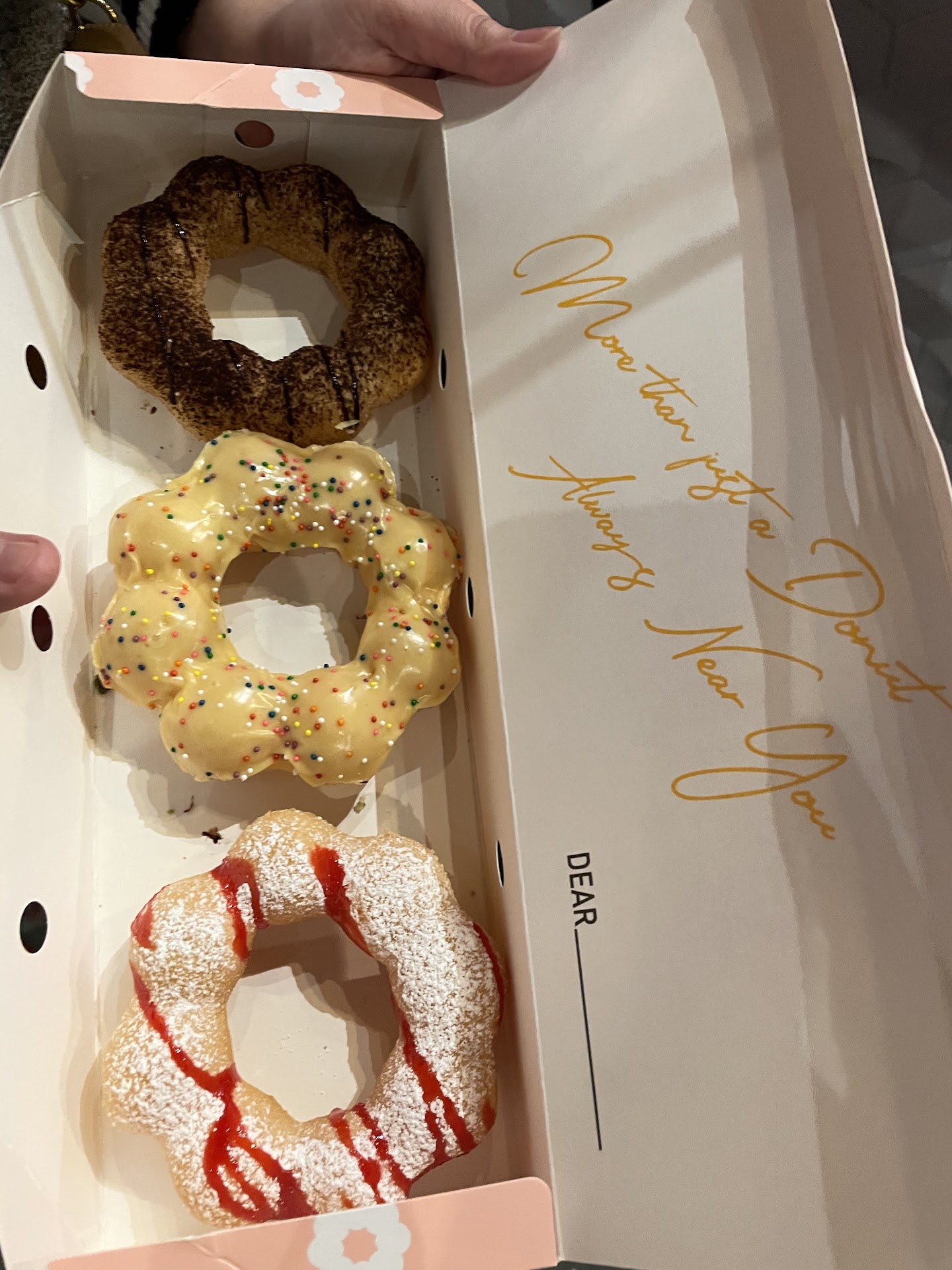 The texture of the "donuts" is very unique due to the mochi flour, and it reminds me of how moist and doughy freshly made Crispy Creme donuts are, but a tiny bit chewier. If you've had mochi, it is not quite that degree of chewiness, but somewhere in between fresh-made donuts and mochi. The flavors do rotate, and it can be a bit pricey (a dozen donuts will run you about $35 after you add in tax), but the quality in my opinion is worth it, or at least worth an initial try. The mochinuts are also a good size, and probably due in part to the mochi flour, one of these treats can be quite filling.