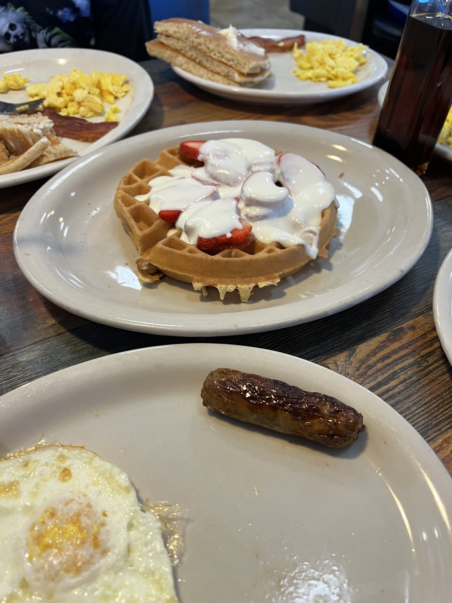 Drove here from Los Alamos on the Sunday before Veterans Day. Parking wasn’t bad, but there is wheelchair accessible parking. The ones I saw and we had to park in was kind of far away. There might be more on another side. When we walked in, there’s a sheet for you to put your amount of people in your party, the time you arrived, and the name of your party leader. Our lovely waitress today was Summer. Amazing waitress, she made sure to give us refills on our drinks, especially coffee with 2 of our 6 party members! Haha. There was napkins, salt, ketchup, pepper, sugar packets, etc! Really what a good restaurant should be. The menus are nice. The only complaint I have is that where I was sitting, I could kind of feel the wall when I moved my body forward and slammed my back into the wall. It was obviously cushioned into the booth and keywords, “I slammed.” You can’t really notice it, and I’m just being nitpicky. Nice and a lot of room. They have to-go boxes. They also have TVs for your entertainment and possibly I think a bar. They have crepes and pancakes, hash-browns, bacon, coffee, but I don’t think they have Dr. pepper. Soda is not watered down. They provide your party with the correct amount of utensils wrapped neatly in a napkin. Those utensils are a butterknife, a spoon, and a fork. Came here 12:37 pm. We were also quickly seated. They seem to be fully-staffed and have a good amount of servers out at a time for such a small establishment. 5/5 stars,...
