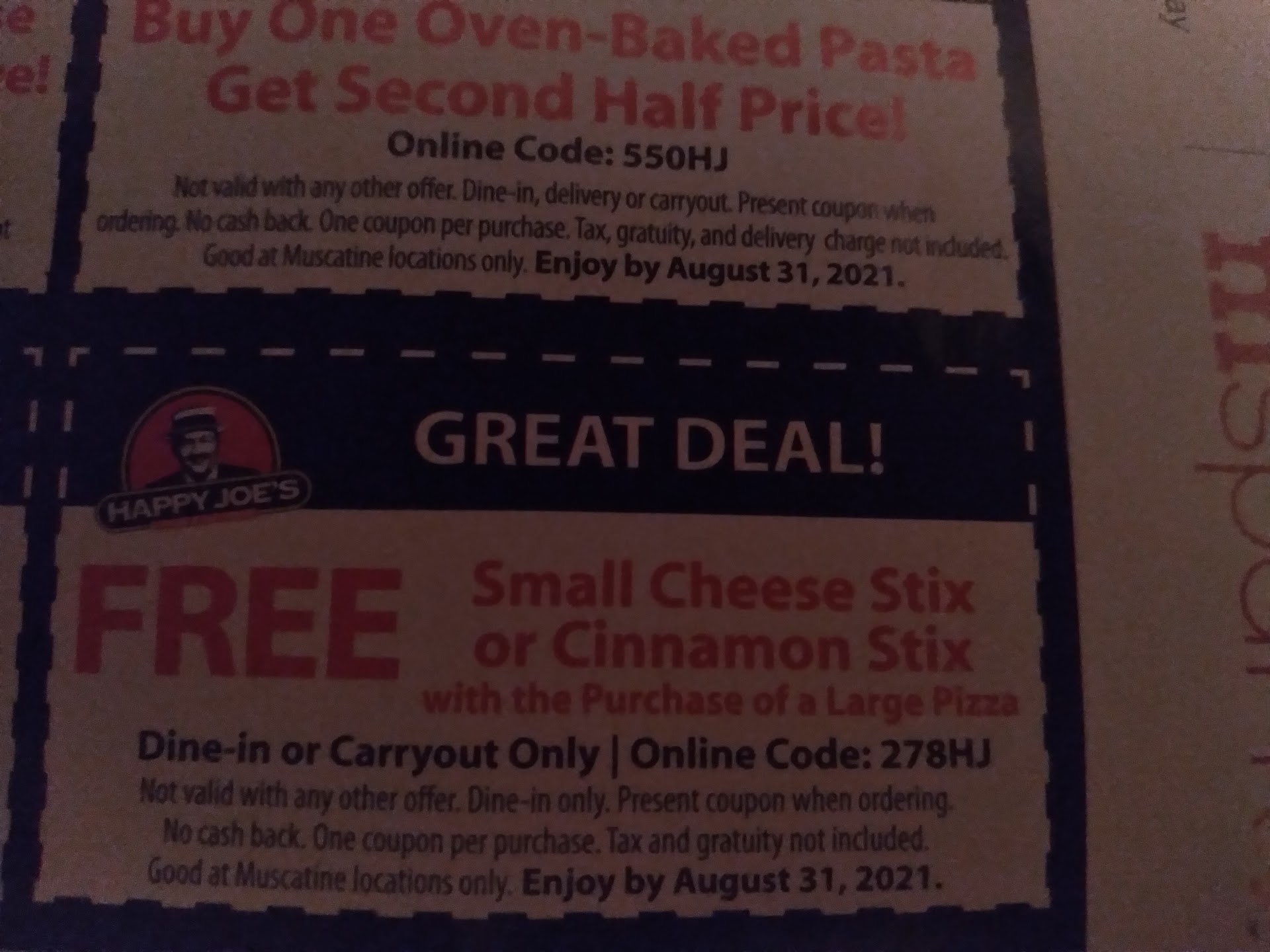 A group of us were visiting from out of town, and looking forward to enjoying some Happy Joe's Pizza. We had not been to either Muscatine location before, and this one was closer. However, the exterior and signage appeared dingy and dilapidated, so we turned around. At first we wondered if it had shut down many years ago. Never in my life had I expected to see a Happy Joe's that looks like this place, so we chose to go to...