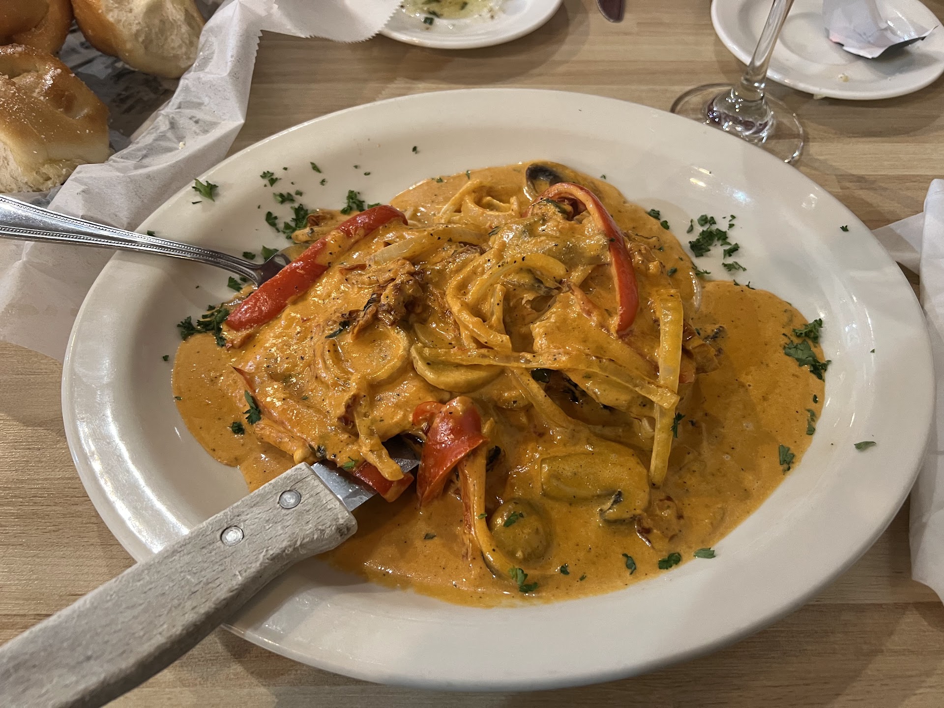 Read moreFirst, our waitress was awesome! None of this is her fault. I’m pretty sure she was by herself at 5pm on a Sunday. My wife is handicap, so the figuring out how to get in when you’re from out of town was more difficult than I’d like to admit. But once we got in, things seemed great. Very quiet atmosphere (almost too quiet) but chalked that up to 5pm on a Sunday and not a lot of people. There were 3 other families in the restaurant. We ordered our food and it took much longer than it should have in our opinion. We waited for over 20 minutes for our salads, 35 for our appetizer and well over an hour for our actual food, which was a nightmare considering we had a 6 year old with us. The waitress was great, I wished she had checked a few more times on drinks but she seemed very busy the whole time. The food was pretty good when we got it, although I think the garlic cheese bread is a little misleading. It’s just a French loaf cut into 1/4 in slices with cheese on top, no...
