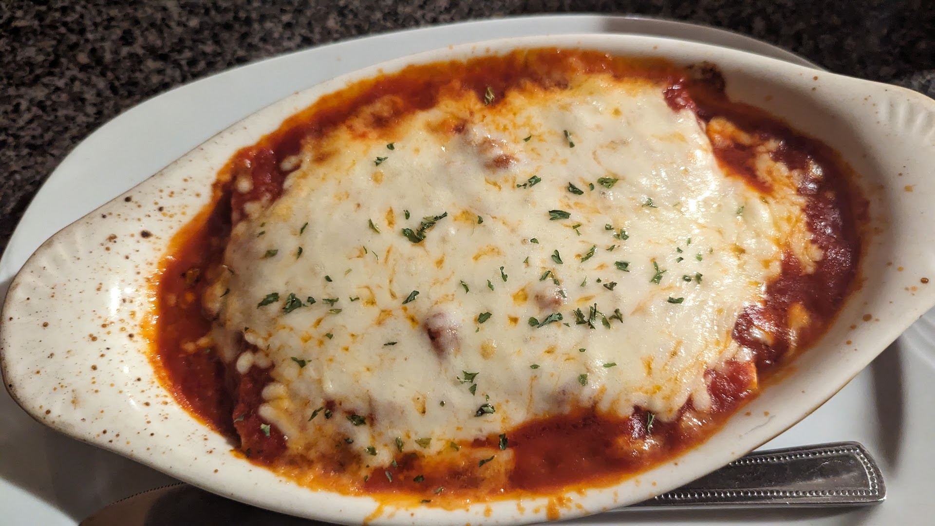 I got the chicken parmigiana and my husband got the manicotti. I tried a bite of his and it was yummy and the sauce was great. The chicken (and this is more of a preference) was not as crispy as I expected it to be and the sauce was perfect. Simple and just enough.