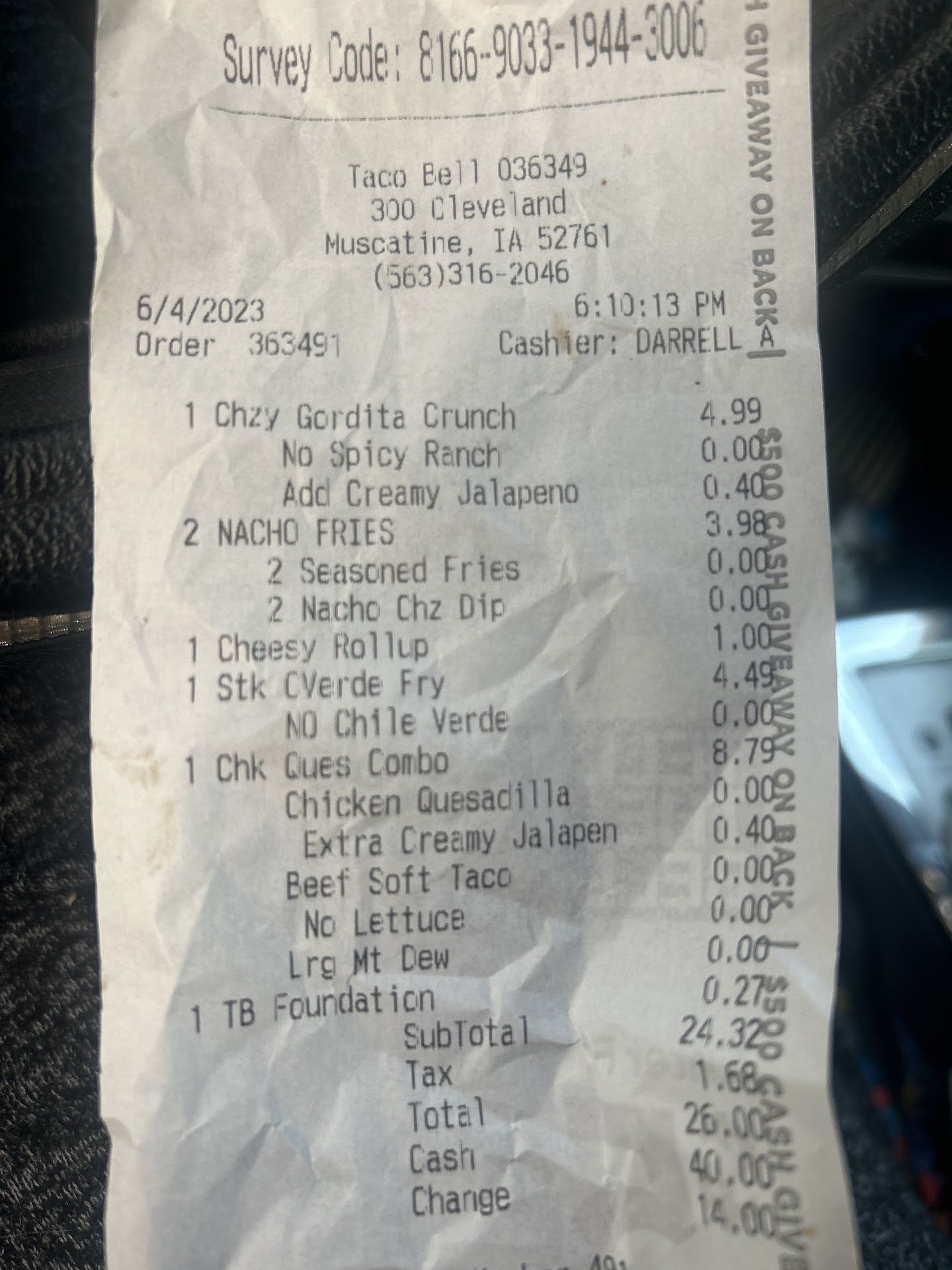 So to start, we sat in the drive thru for just under 20 minutes with only one car in front of us... But that was expected because the Muscatine taco bell has always been the furthest thing from FAST food. When we get to the window we are told we need cash because their card machine went down... That's not a big deal either as tech issues happen and thankfully we had cash, but this would have been good information to provide when we ordered in case we had only our cards. Now the issue. We ordered two crunch wraps, two tacos and two burrito supremes. 6 items. We get our food and start heading home. Checking our bag we find no tacos so we call them and explain. We are told to come back and come into the lobby to get the rest of the order we paid for. So back to taco bell we go. We get there just as who I assume was the manager was about to lock the door. We tell her that we are just needing the rest of our order that was not in our bag. She says she just closed the lobby and we have to use the drive thru... Which now has 7 cars in it. 20 minutes into our second wait in the drive thru with now having only two less cars in line front of us I decide to call again to see if they can just bring them out. I tell them that we already have a combined 40 minutes of time and the purchase price of our food invested in these tacos but I really don't want to add another 30+ minutes to that investment. I then get told I can stay in the drive thru or come back another time to claim my already paid for food.