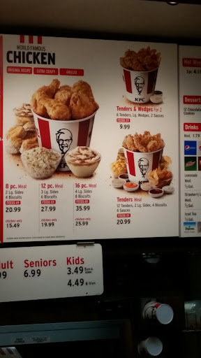 Ā Ā Ā Read moreI was visiting a friend in Muscle Shoals, AL. We decided to eat at KFC buffet and get our senior discount too. The food looked good and they had a large variety of side items. There was dressing, candy yams, green beans, corn, slaw, white beans, mashed potatoes & gravy and peach cobbler for desert. It was all you can eat, there was crisp chicken and original receipt to choose from. The breast were large the thighs and legs were also nice size pieces. There was chicken livers on the buffet too. the lunch price Included your choice of a drink, cola's, coffee and tea sweet and unsweetened. The counter lady let everyone know 15 minutes before closing the buffet for additional trip to the buffet. I went for the peach cobbler to complete my meal. I checked their food service score before ordering they posted a score of 96. This is a high passing score with only minimal infraction by an employee. I would take a friend to this KFC in...