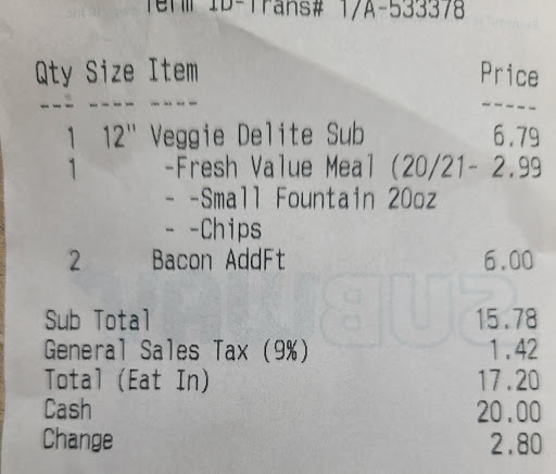 Ā Ā Ā Read moreThis location made me a BLT, but when checkout came around told me that particular sandwich no longer exists and they have to ring it up as a veggie add bacon. Fine. Until you literally charge me the price of a second sandwich as the price of added bacon. I could have paid less and gotten more by getting a different sandwich. But i didnt know this before ordering and making this. It's been my favorite since i was a kid. This is really a break down in communication and lack of training to the employees up front to tell me this BEFORE they made my food. I would have simply ordered something else! As it was, I felt obliged to pay for it and avoid an embarrassing situation with the long line behind me as I wrestled my infant simultaneously. I went back and asked to double check I wasnt rung up incorrectly and they stuck by it. Moral of the story, ask before you order as this rebranding has changed alot and apparently no one can be bothered to explain that...
