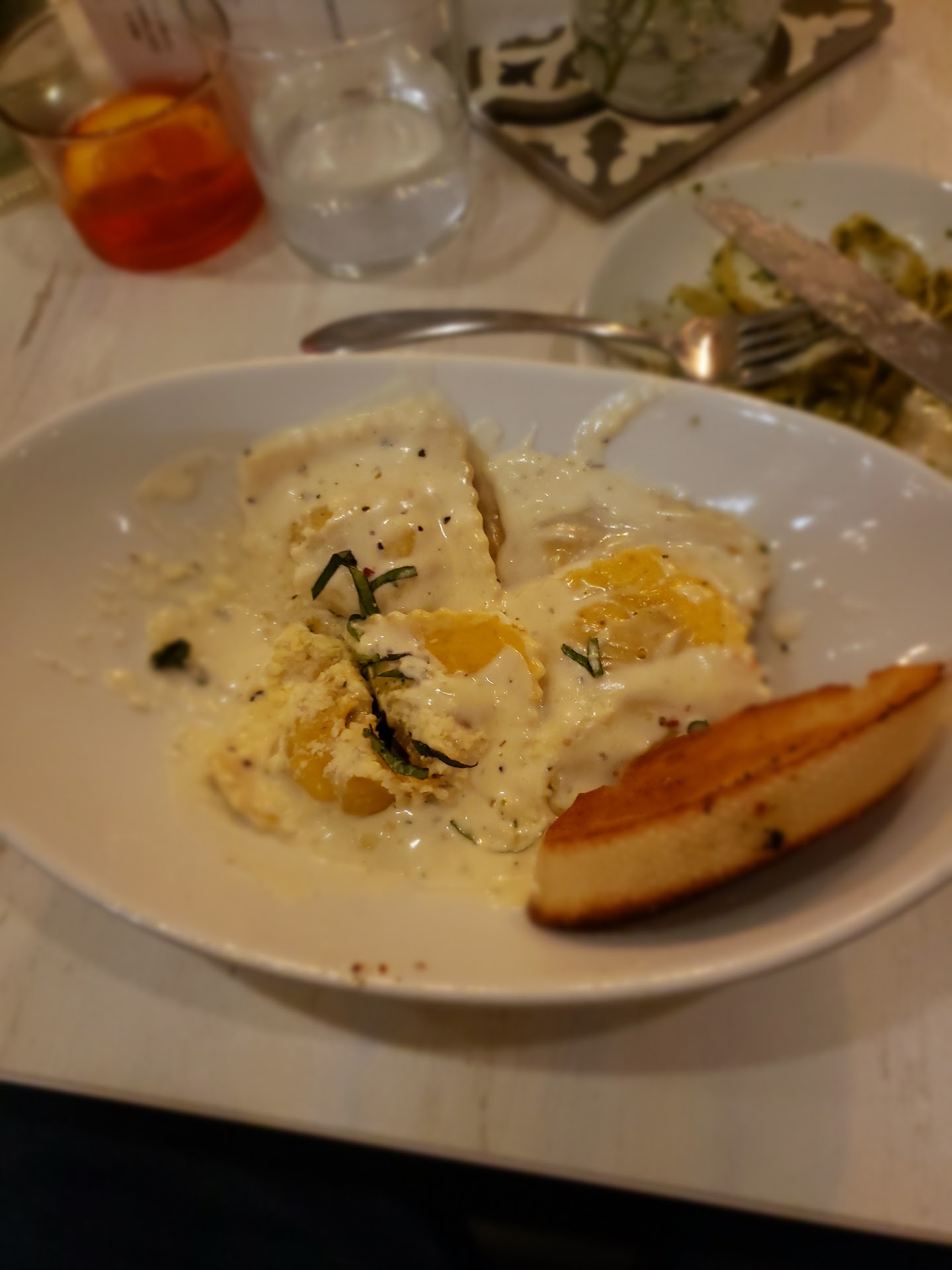This is one of the best restaurants in Muskegon! It has a quiet and cozy atmosphere with friendly and attentive staff. The smaller setting makes for both a fun meal with friends, and a relaxed fine dining experience. We decided to order the classics. We started with the bruschetta, with tomatoes so fresh you'd think they were straight from the vine to the table! Again, deciding on a couple of Italian staples, we went with the Spaghetti w/ Meatballs and the Shrimp Scampi! All of it was amazing! The meatballs were big, juicy and cooked to perfection.The sauce was a perfect consistency. Flavor was a spot on mix of savory, with just the right amount of that sweet tomato tang! The noodles were perfectly cooked, with sauce sticking to them like it should! Served with a slice of grilled bread. Highly recommended