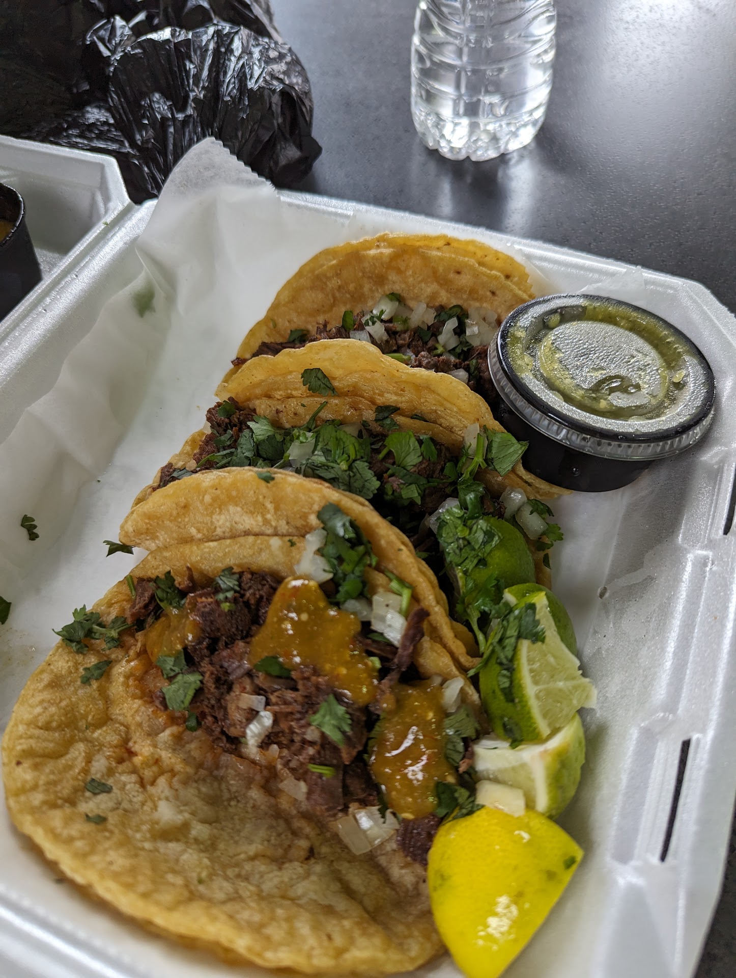 Fast service and cheap food. My son got the chicken fajita tacos and I got the vegetarian taco with all the toppings. One vegetarian taco fills the entire take away container. My son said his tacos were good, and while he prefers shredded chicken, he said the cubes chicken was good but slightly dry. The vegetarian taco is filled mostly with rice and then had cheese, onion, cilantro, tomato, and sour cream. Their verde sauce is our favorite...