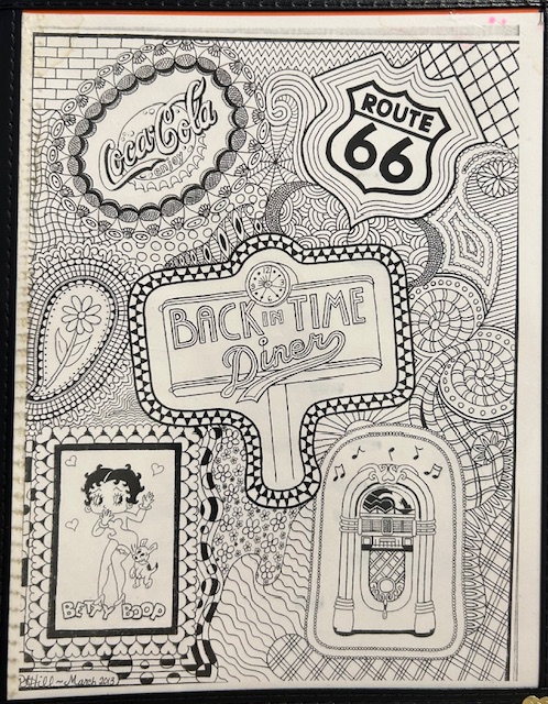 Back in Time Diner is a cozy, clean comfortable, 50’s 60’s themed diner. It is decorated with Coca Cola, road signs, pictures of era music icons and other paraphernalia. Ads for the local businesses are laminated under the clear plastic table tops. Most of the businesses have been closed for years and long forgotten. I always enjoy searching the advertisements for odd ball companies or funny names while I wait.