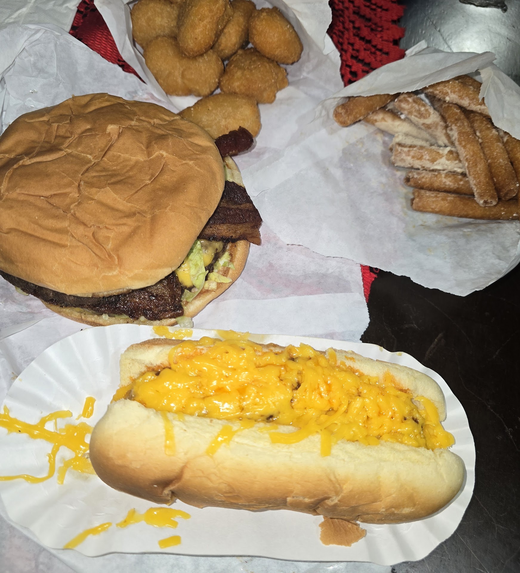 Read moreHad heard good things so we tried it, we ordered 3 burgers, tots, onion rings, and peppers and onions. I started eating my tots and noticed a distinct Marlboro flavor that I find undesirable in my food. Soon after I see the cook saunter out cigarette in hand and realize the source. I move onto my burger which can only be described as an over cooked patty which was assembled and sat on before it was delivered. I decide to try the onion rings, they are bland, but at least no cigarette taste and as I continued my dining experience it reached its climax as I found a hair cooked in my onion rings. My wife and I stopped eating and are currently headed...