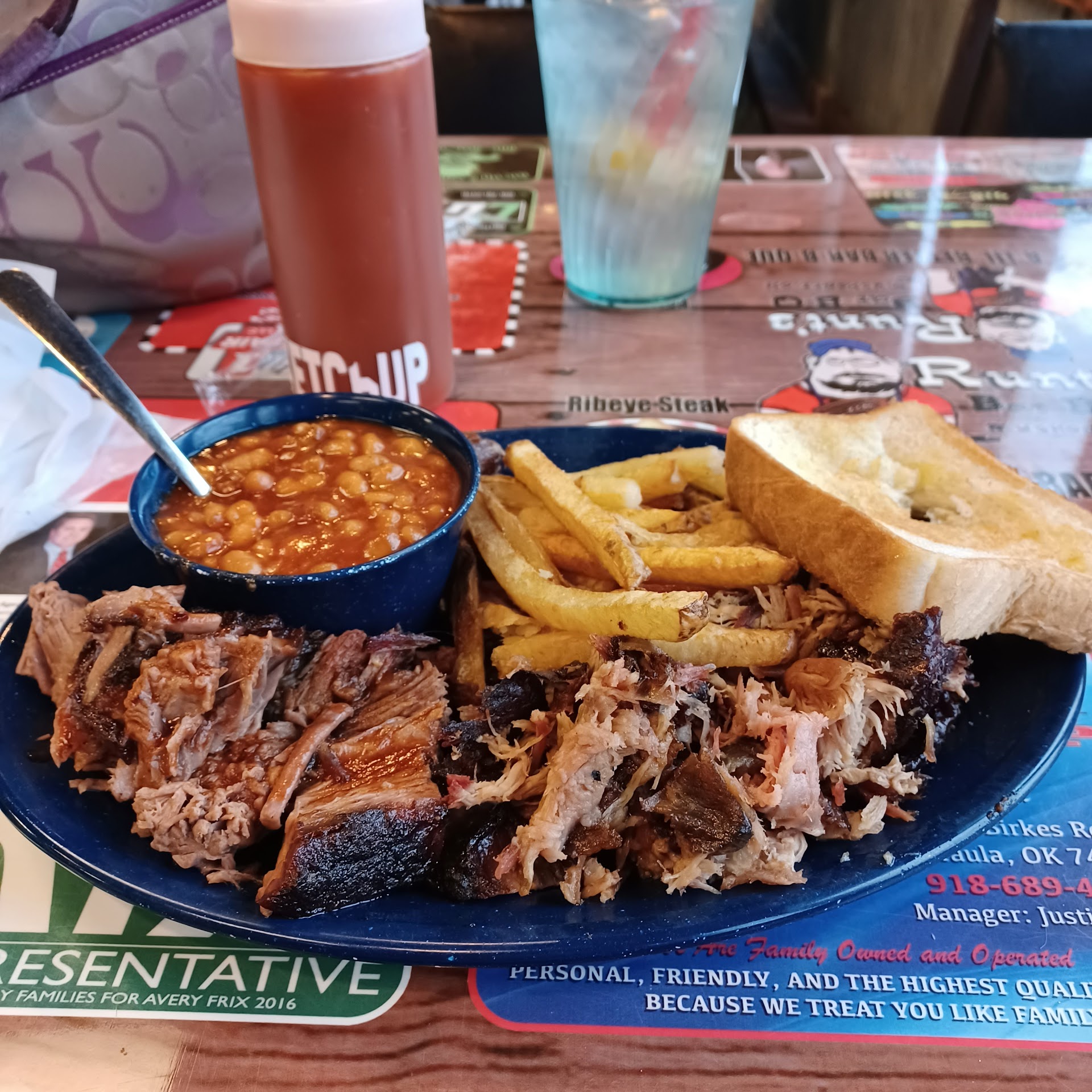 Read moreThis is good BBQ. The restaurant is a typical well-worn Oklahoma BBQ shack. Rustic décor: barn tin, stuffed animals, walls of rough-cut lumber and a hint of hickory smoke in the air. My wife had the burnt end sandwich with potato salad. This was smokey, tangy beef burnt ends, sandwiched between two slices of thick buttered Texas toast. Absolutely recommended. The sides here are excellent. I had jalapeno black eyed peas with my “Salty Dog.” The Salty Dog is an unusual version of a Ruben: two meaty, spicey hot links, sliced, with kraut, Swiss cheese, and mustard between two slices of rye. A great combination of flavors, but challenging to eat. The casings on the links were a little tough; making a clean bite on the sandwich was impossible. It turned into a tasty knife and fork sandwich. The service is prompt, attentive, small town friendly. An opportunity for improvement: the parking area in the back. Unfortunately, today, the only spot available was by the dumpster and the recycle grease bin. It smelled back there, like dirty diapers, spoiled milk, and rancid grease. The area looked as bad as it smelled. The leaking or overflowing fermented juices had drained onto the parking lot. A challenge to navigate when first stepping out of your vehicle. After that smell, man do I really want to eat here? Do not Park back there. A little attention to clean this area, would greatly improve a customer’s first impression.