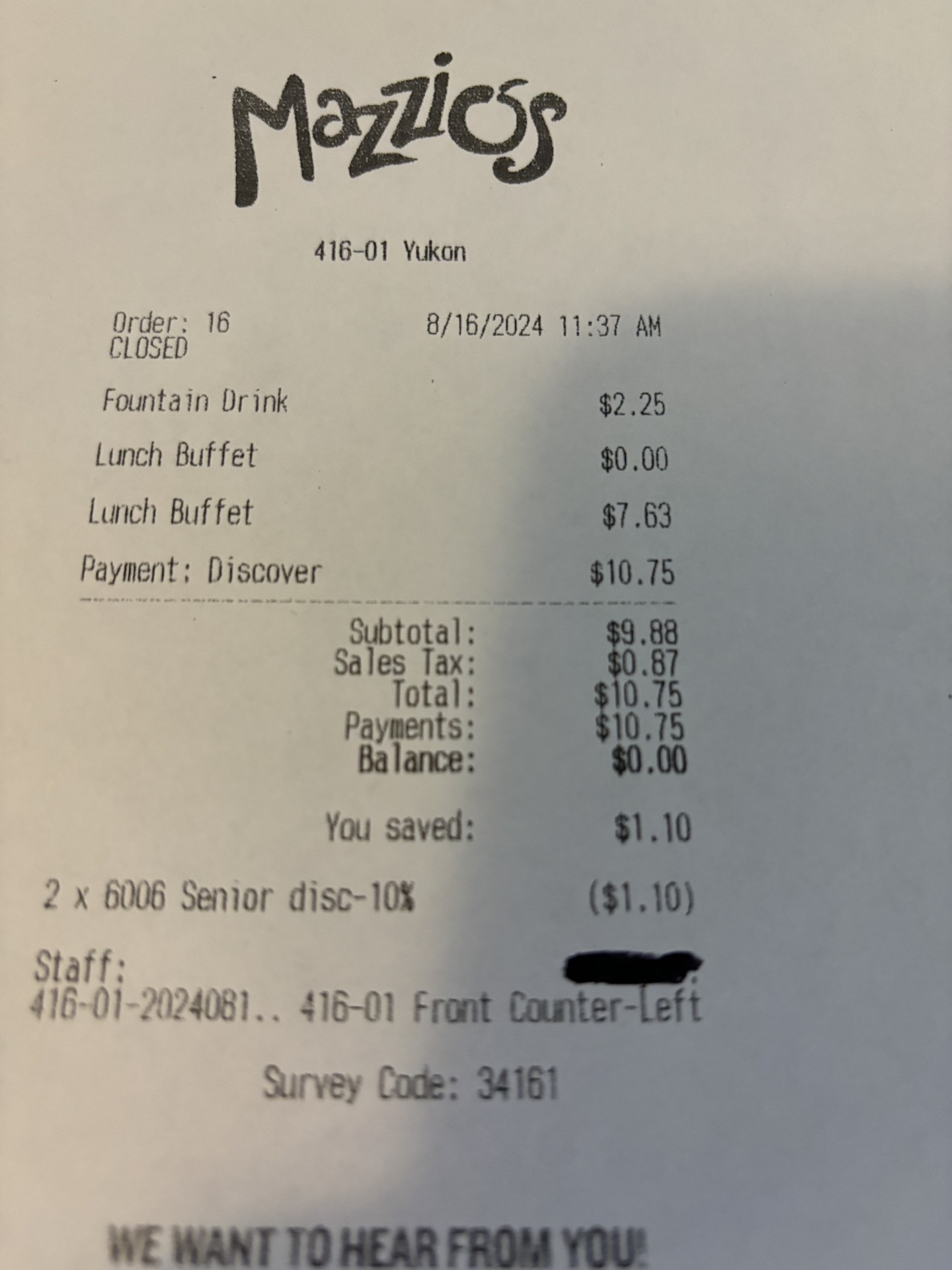 We left and went to another Mazzio's and we were charged the correct price of $10.75. In addition, the second Mazzio's was extremely clean, staff was extremely friendly and the selection of food was fantastic.