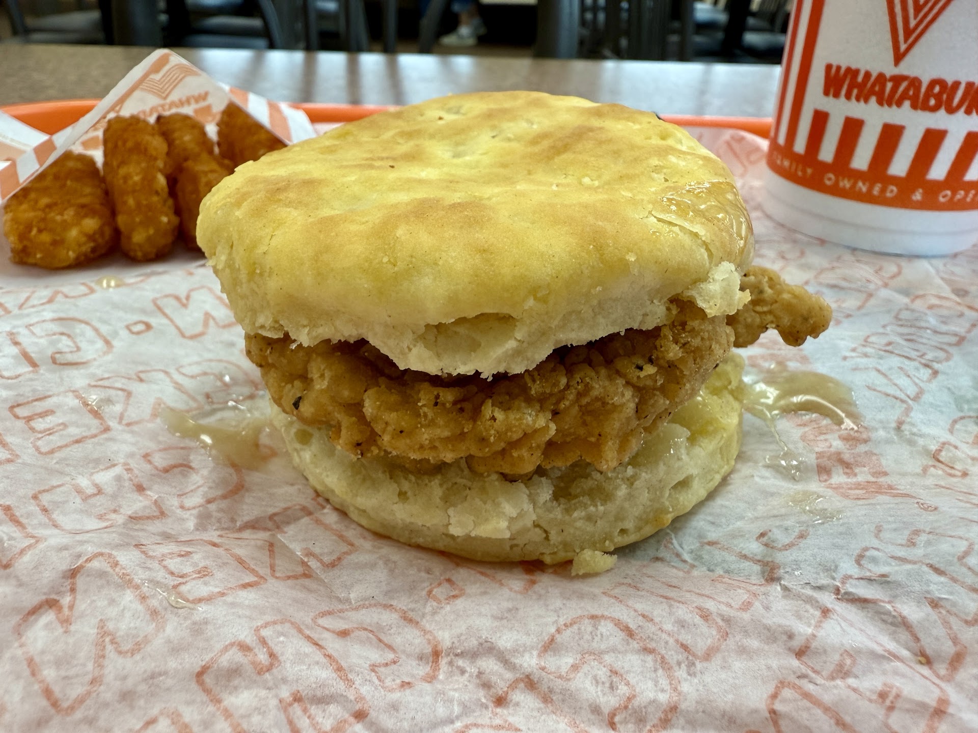 I was in town visiting family and made a stop here one morning for breakfast. I've never had Whataburger for breakfast before. I got the Honey Butter Chicken Biscuit , Hashbrowns , and a Sweet Tea and ate in the dining area. The cashier was very nice and talkative and brought my food out to my table with a carrier of things you might need like napkins , ketchup , utensils , etc. Also later after my meal the Manager came by asking how everything was and also talked to some of the other diners.