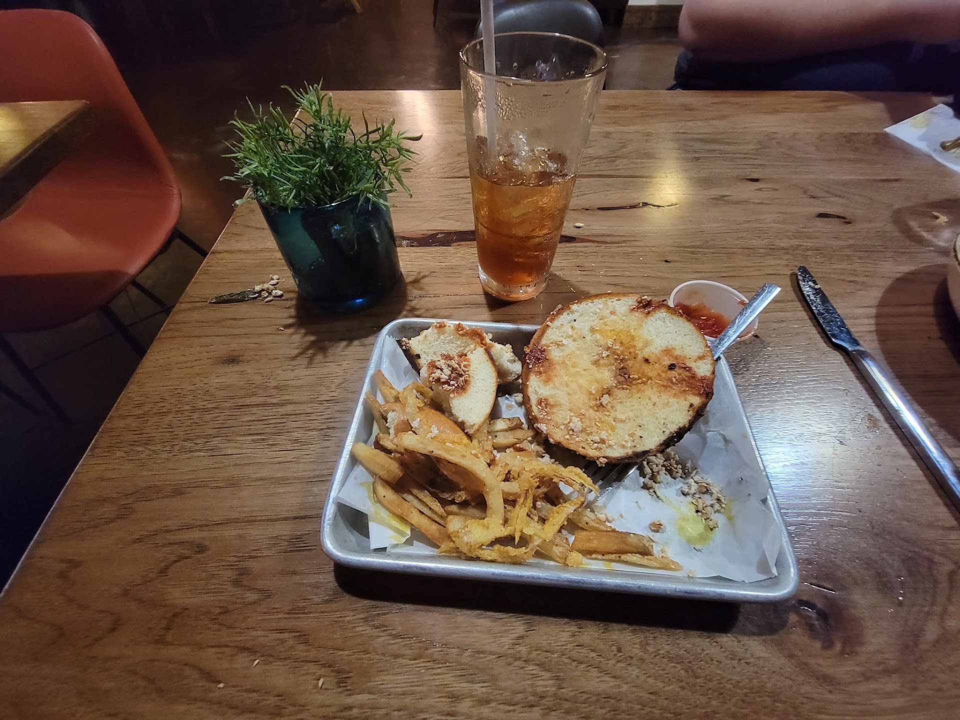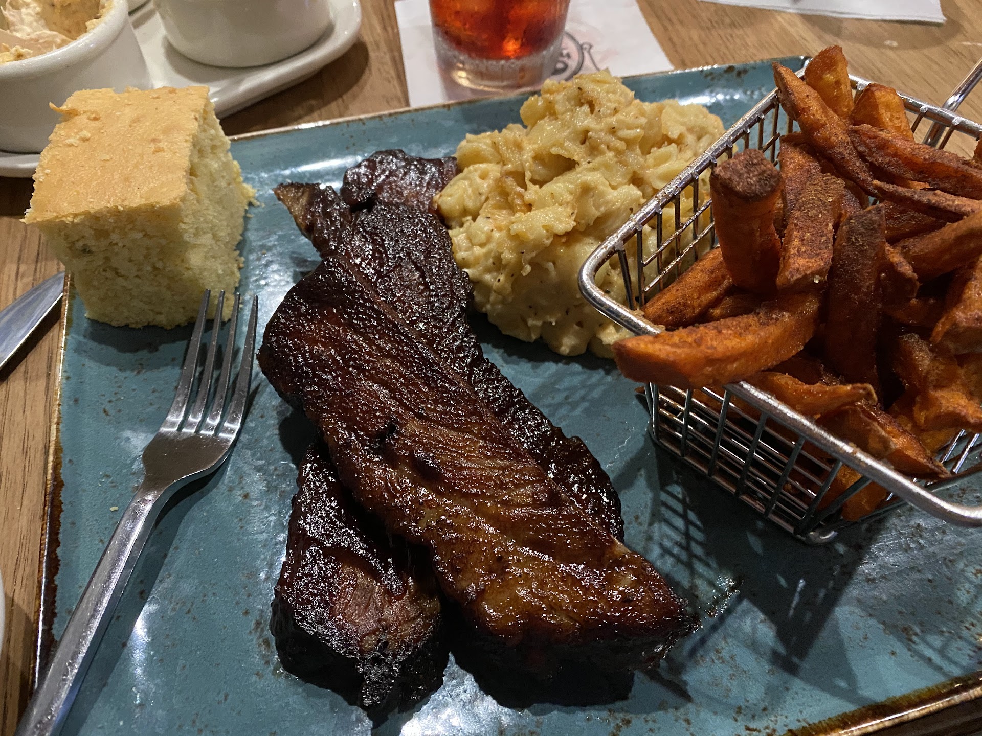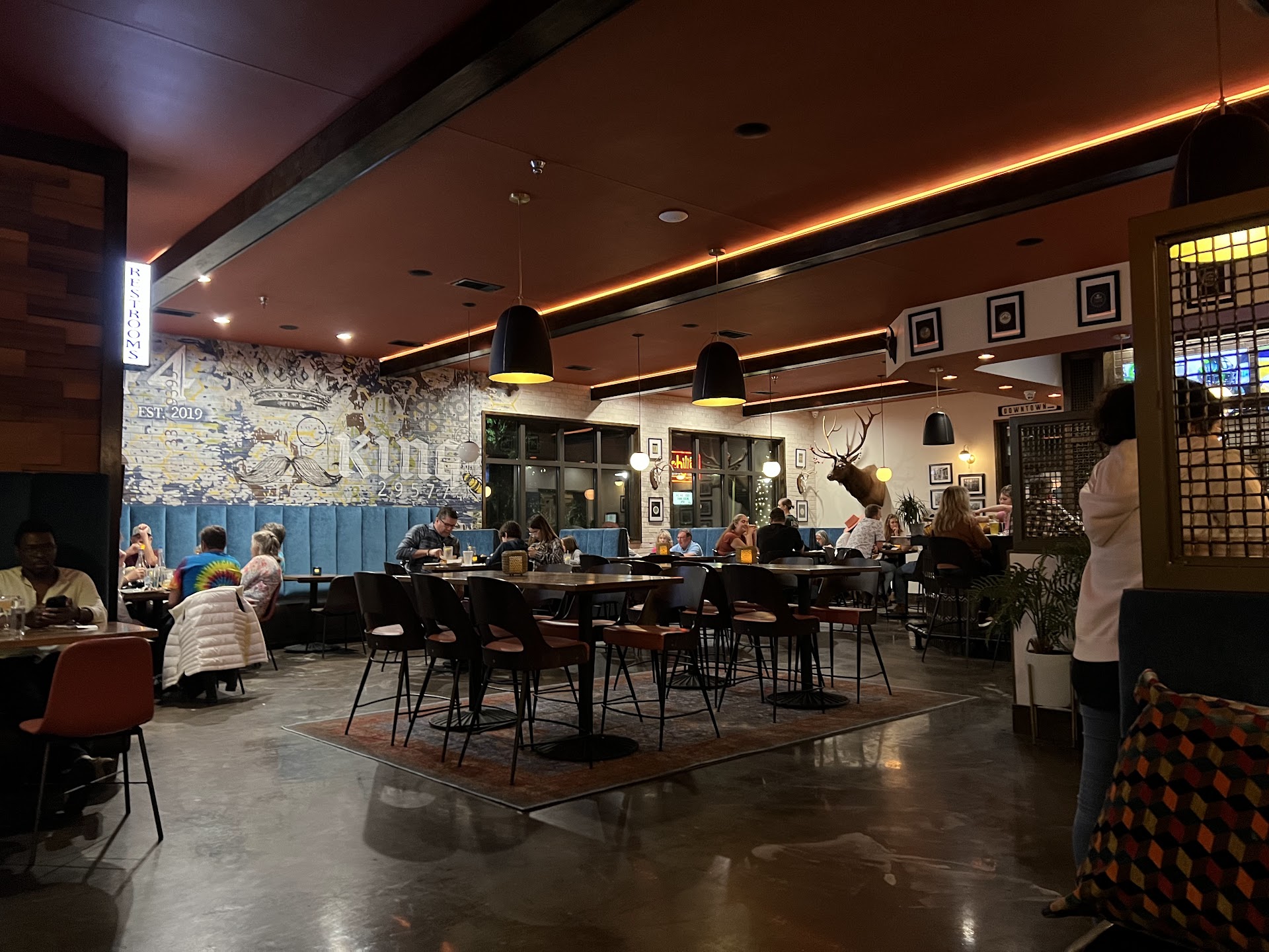 Underwhelming. I was really hoping to enjoy my first visit here, but not so much. For starters we were seated right next to the kitchen even though other tables were available. And other patrons were crammed in around us, still with other tables available. And the entire place was really loud. Loud as in hard to carry on a conversation with the people at our table and hard to hear the waitress. The menu had pub food, handhelds, burgers, salads, and BBQ. When we asked the waitress what she recommended/liked she right off said the pork BBQ and pork chops and then went on to recite the entire menu. So not really recommending anything in particular but also recommending everything. The people we were with said they heard the BBQ was good. So again asked the waitress which she’d recommend the pork or brisket and she said the pork. People in our party were persuaded and 2 pork platters were ordered and 1 pork sandwich and the fried chicken. With that behind us we could start to socialize and converse. Nope. Waitress came back only to share they were out of pork but only for the platters. Had pork for the pork sandwich (???? Pork is pork….enough for a sandwich but not for a platter???hmmmm.). So the 2 pork platters switched to the less popular brisket. And so having placed our order for the second time, we could continue to socialize and converse. Nope. Waitress came back to say now they were out of pork for sandwiches too. SURPRISE! Ok, …. Switch to the white cheddar chicken burger. Luckily the restaurant had all the ingredients for our tables’ THIRD order. Food arrived with cold sweet potato fries for my side (with the white cheddar chicken burger). And I don’t mean they had cooled slightly. They were cold. Moving on to the sandwhich. It was mammoth, too big to eat and required a knife and fork. It wasn’t a burger as listed but a fried chicken breast. Unfortunate since I could have ordered the fried chicken outright if that’s what I wanted. The lettuce was limp so I took that off right away. The cheddar was melted on the chicken and resembled a watery queso sauce and it didn’t add any flavor. The brisket was fatty but flavorful for those who had it. The venue has a nice enclosed patio area as well as seasonal seating...