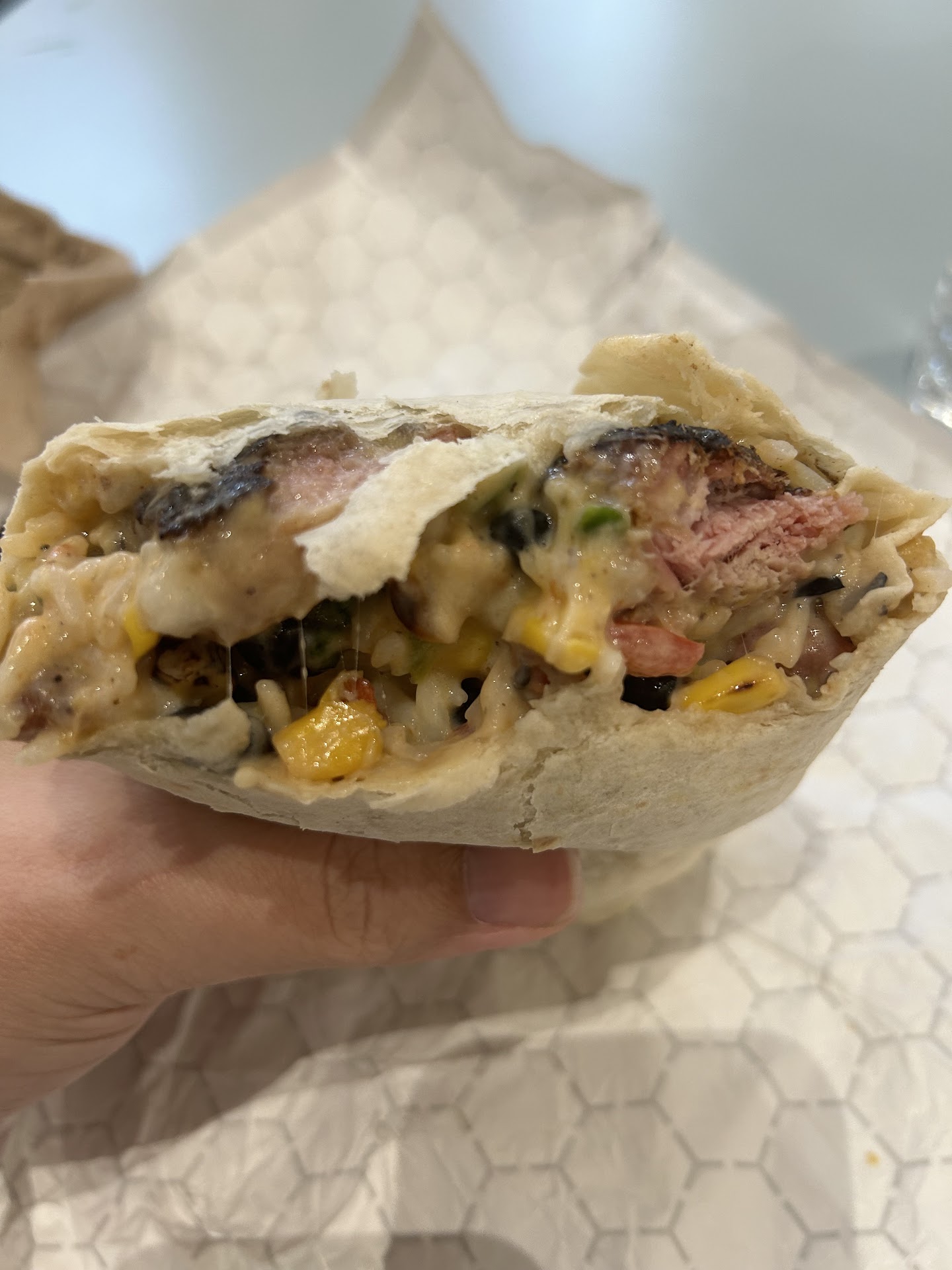The burrito was definitely enough for one very hungry dude and probably two people just grabbing a bite. Serious heft to this thing. Possibly the corn but more likely the burnt ends gave it a pleasant smokiness on top of the other fresh tasting ingredients.