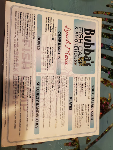 Read moreMy wife and I normally have a great experience at Bubbaâs Fishcamp and Smokehouse in Myrtle Beach but today we had a horrible experience and will not be returning. When we first entered the restaurant, I was overwhelmed by the loud, head-banging music that was being played. Not only was the music too loud but I donât think it was being played for the patrons as there was one older couple, one younger couple, and one young family with four children in the restaurant when we arrived. My guess is that the staff chose the music that was being played in total disregard to the tastes of their customers. After being seated I asked the music to be turned down as I am a disabled combat Veteran with hearing issues and this was met with some resistance and a laugh by our server Kelsey and the manager. After being seated we were given our menus which were extremely sticky, unsanitary, and left a residue on my hand. There was a stain on one of the menus (see attached photo). I guess the staff here do not have time to wipe down the menus even though the restaurant was not that busy and the manager had time to socialize and play on his phone but not attend to more important job-related duties! After my food arrived, I had to ask for paper towels as there were only a couple of rolls in the bar area but none near where I was seated. I ordered the rib plate, and the ribs and coleslaw were very good, but the fries were too salty and I could not eat all of the fries. While I was eating, I was asked by the âphotographerâ if we wanted to have our picture taken. I politely declined as this is the second time recently I was asked in a restaurant to have my picture taken in an effort to extort more money out of me for a photo I could take myself and print at home or a local CVS for a lot cheaper. Donât the restaurants make enough money off us from the food and alcohol we purchase where they donât need to resort to tourist trap tactics in an effort to make more money? It is unfortunate that Bubbaâs did not live up to our expectations we had based on our prior experience. Hopefully management will make the necessary changes to return this restaurant back to its...