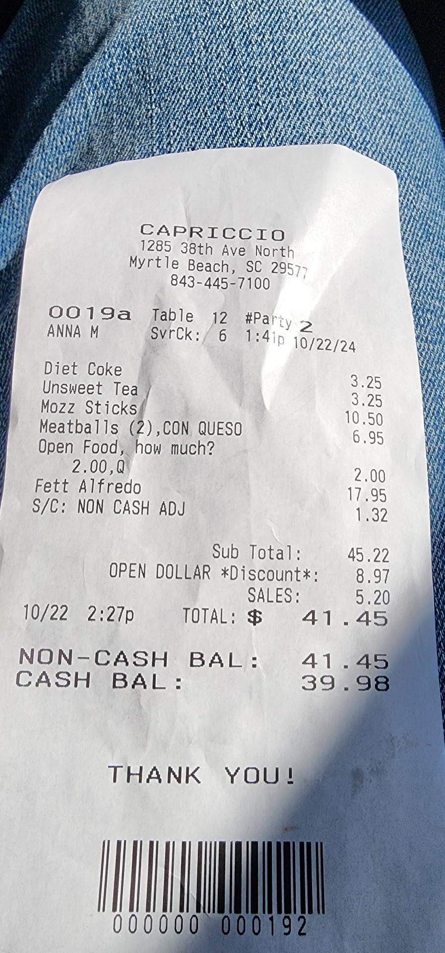 Read moreMy cousins, boyfriend, and I dined in around 8 pm on 7/2/25. We had a waiter (did not get his name) Caucasian, probably 40’s-50’s with a pony tail. He told us the specials, and was very attentive the whole time. He kept our drinks filled and asked every time he passed by if we were satisfied. The food took about 15-20 mins to come out, that was no problem. My boyfriend and I were on the same check, and my 2 cousins were on the same check. Both checks tipped $5. So he got a $10 tip. He even boxed our food to-go for us which was nice. The problem came whenever we were going out the door. My cousin was the last one out and I was ahead of her. As we were walking to the parking lot we heard “No class!” We were very confused, I didn’t think he was talking to us until I heard the door shut. My cousin told me it was our waiter that said it TO US. I thought it was because we all had on shorts but then I realized he might’ve been upset about the tip. I got the manicotti and the other 3 got fettuccine Alfredo. My manicotti was good but they all said the Alfredo tasted bland and store bought. They could not even finish it. We did NOT complain any though because that’s not the type of people we are, we just accept our losses and call it a day. The waiter should’ve been GRATEFUL we even tipped. I have the upmost respect for waiters/waitresses because I know tips are what they depend on the most. But why would we tip a large amount for food that was not very good and the tea had NO sugar whatsoever, I would've been better off getting water. To the waiter—you’ve got a lot of nerve following people, what if we had a g-n and blew that ponytail off? What if my boyfriend would’ve heard you and asked to fight you? Control your anger! I wanted to go back in and tell your manager how weird you are but we took the higher road. The manager might be weird too if they let employees do stuff like that. You look retirement age and you gotta clock in...