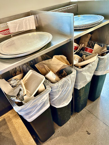 When trying to find a table to sit ALL have leftover food and crumbs, The trash can is overfull ( See Pic ).