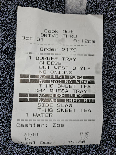 Ā Ā Ā Read moreWe normally go to the Cookout in NMB and have never had the kind of experience there that we did tonight at Carolina Forest location. To be fair it is Halloween and they were pretty busy like all the fast food spots in that area. But... Firstly, the girl who took our order acted dumb and like she didn't give a crap and didn't want to be there. We had to repeat things multiple times as if she wasn't paying attention. She was short tempered and slightly rude. "Snappy" The order was still wrong despite repeating things and we were somehow overcharged. So we ordered: 2x Quesadilia tray with 2 sides = $5.99 (Should have been $7.99 but she only rang up a 1x Quesa tray and I didn't get the 2nd one) Burger Tray with 2 sides = $7.99 Side of Slaw = ??? Total (before tax) = $17.97