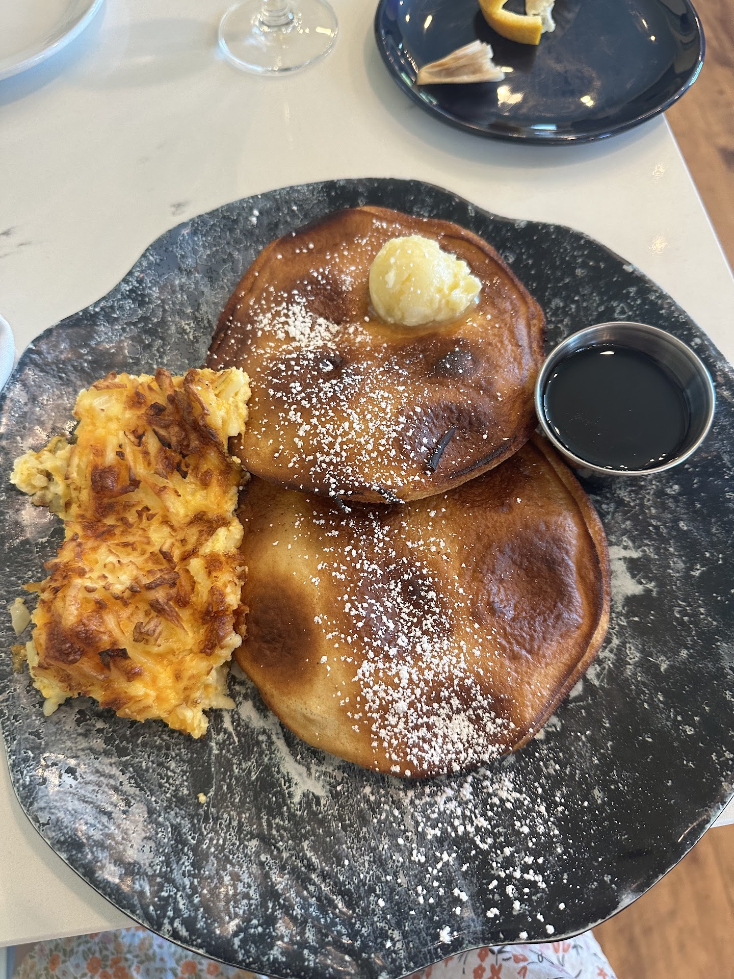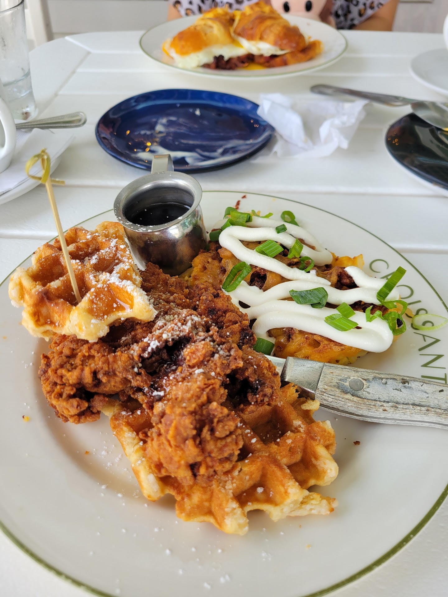 For our main courses, I chose the chicken and waffles, featuring crispy chicken perfectly paired with fluffy waffles and drizzled with honey. The loaded home fries served alongside were complemented by an exceptional scratch-made sour cream, adding a unique twist to this classic breakfast dish. My wife and daughter enjoyed delicious croissant breakfast sandwiches, which showcased thick-cut bacon and eggs cooked to perfection. Meanwhile, our children devoured the kidās pancakes with sausageāhands down, the fluffiest, scratch-made pancakes we've ever tasted, served with authentic maple syrup.