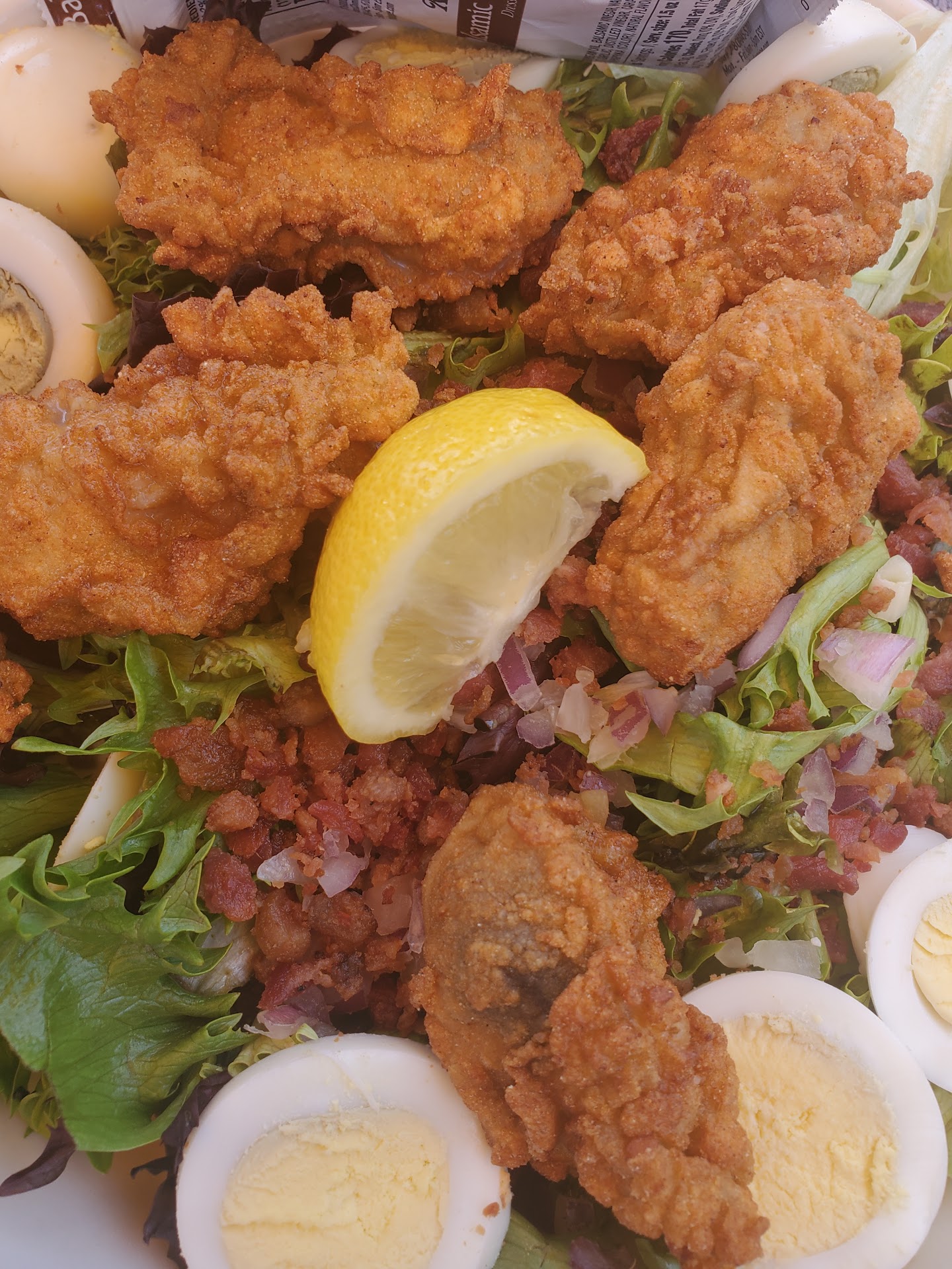 It was my first time trying fried oysters and I was super impressed by the light batter and crispy crunch. I wish that I could have eaten more, but my stomach said "stop". We were able to box up the salad which was a diverse mix of greens, bacon, onions, and eggs. Dressing came on the side along with homemade tartar sauce and cocktail sauce.