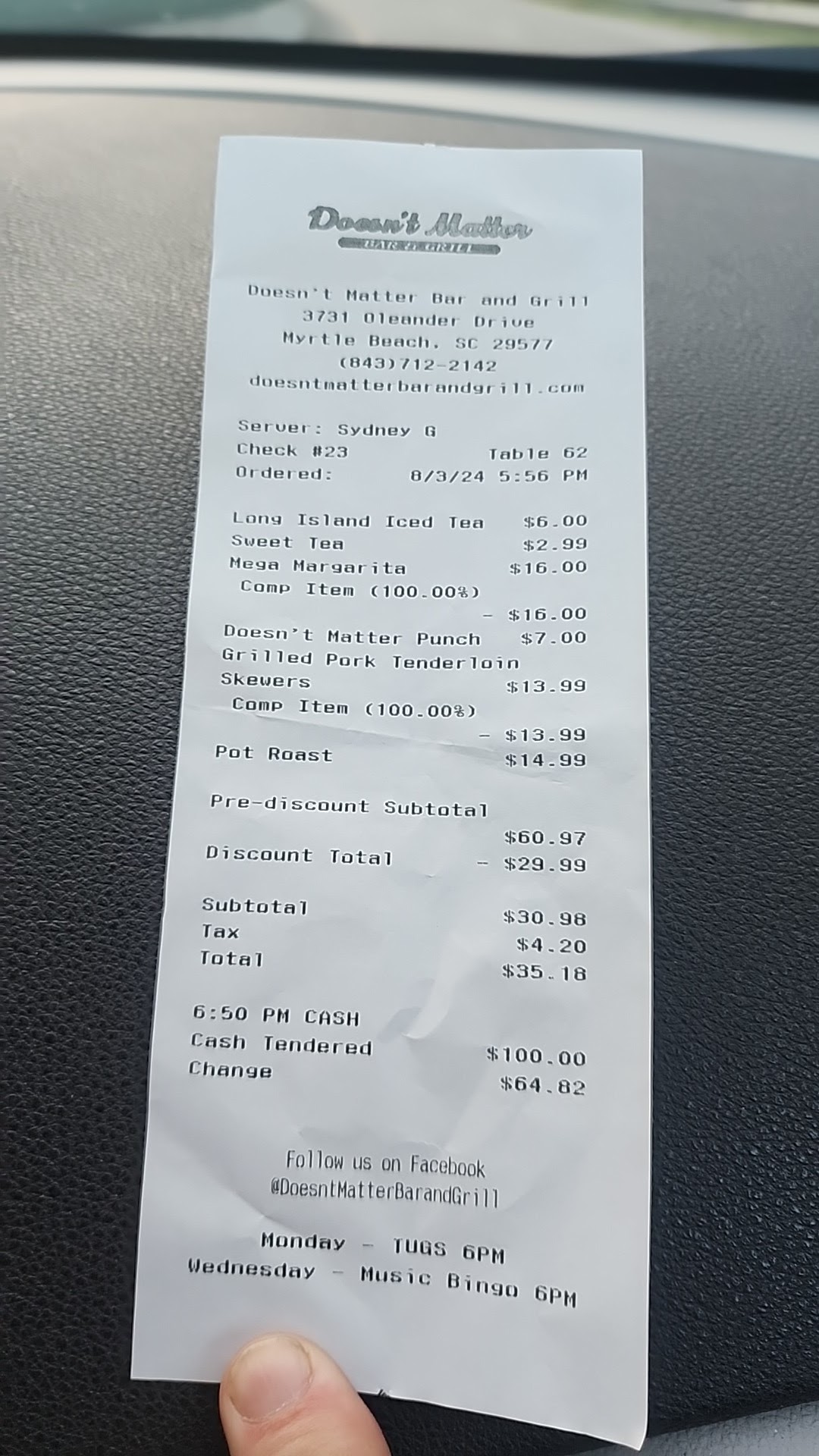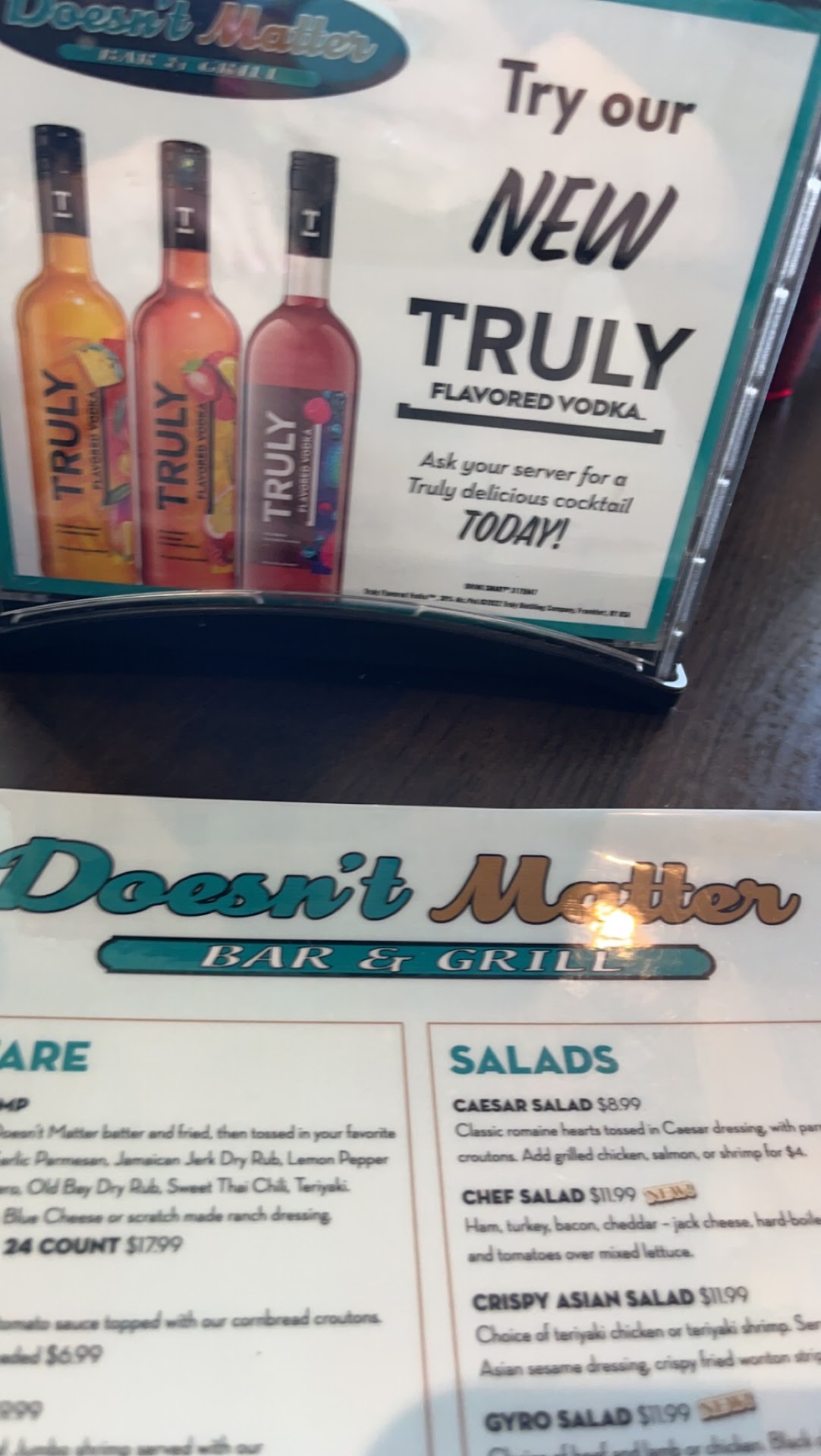 I asked my husband where he wanted to eat and he goes, "It doesn't matter!" So we got in the car and just started to drive to where we needed to be at 2pm. We were both hungry and wanted to eat before arriving at our appointment at 2pm. I come upon a McDonald's and then seen a sign for "It doesn't matter" I didn't tell him where we were going. We pulled up to the resturant and he asked what are you doing. I literally said "it doesn't matter!" Then I laughed and said you challenged me and then without realizing it we ended up going to It doesn't matter bar and grill. We got out of the car and went in and immediately laughed and told the host we are here all because my husband wanted "it doesn't matter! The jokes on them i guess. They have a good menu, the food was fresh, hot, and was reasonably priced. Great motto. Thanks for making our day and visit a pleasant one. It doesn't matter what you have, it's all good. 😀 I had the hangover burger with fries (you get alot of fries) he had the corned beef and cabbage. Highly recommend going you'll have...