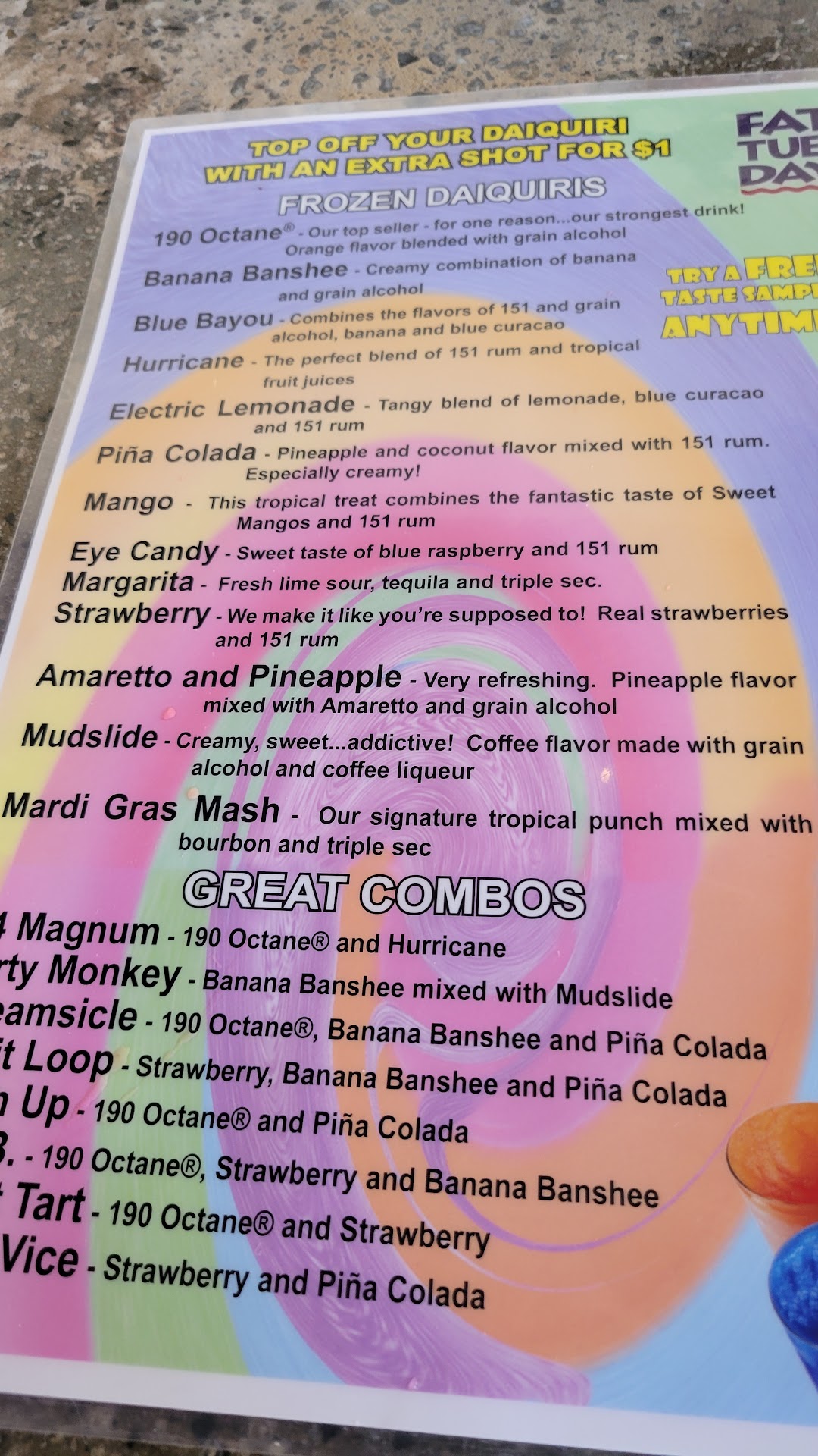 We used to have a Fat Tuesday in Baltimore and man have I missed it. I actually had no idea they were still around until when planning our Myrtle Beach vacation I found out there was one at Broadway on the Beach. Our first night in town we headed right out to check it out and were pleasantly surprised to find out the small frozen drinks were only $3.50 for Happy Hour (which they have every single day nonetheless), floaters and Fireball tooters were only $1 also. Pat and Michele were our bartenders the first night we were there and they were absolutely a blast to chat with, really made us feel welcome. We had so much fun the first night we went back the next evening to check out more of Broadway on the Beach and to take advantage of their happy hour again before the madness of the weekend started up. D was our first bartender, extremely friendly and personable, we could have chatted with him for hours but he was getting off before having to pull another shift in a couple hours and his replacement was Moe. Moe at first seemed a bit standoffish but the more we interacted with him he just seemed to be a little on the shy side perhaps but overall the other 3 were our absolute favorites and a great fit for Fat Tuesday. All of the frozen options are great but my favorites are 190 Octane, 44 Magnum and Hurricanes, all with the Everclear Topper, they're definitely not your mother's daiquiri, you will feel these babies. Counting the days till next year's vacation which will be much longer than this one to allow for more Fat Tuesday...