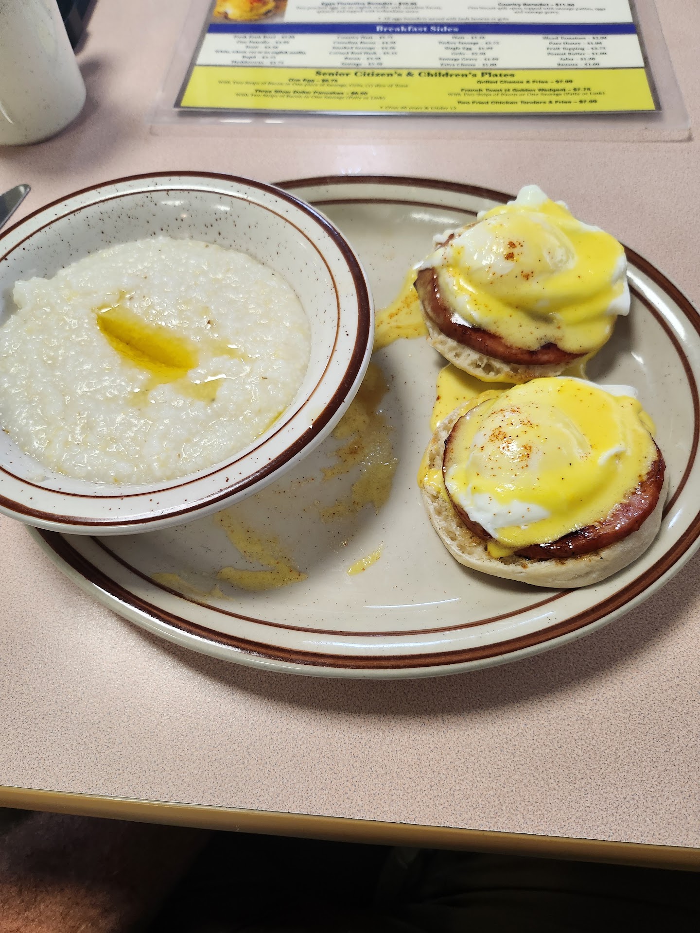 Read moreI decided to try this place because im a huge lover of eggs benedict, and i found their menu online and thought I'd try it. Nothing super special as you just pull in, but then it's more about the food than the atmosphere. Upon walking in, it's open and filled with tables. We got here at 0800 on Saturday morning. It wasn't packed and didn't fill up the 45 minutes we were here. Damari was our server, came over right away, and was very kind and patient with the kiddos and very attentive. Always there to ask if we needed anything and how the food was, but didn't hover. Kids had French toast and the other a cheese omelet. They were both great, kids didn't like the grits, but then they prefer cheese grits that I make at the house. I had the eggs benedict with grits. The food is not seasoned from the kitchen, but then that is fairly common nowadays.