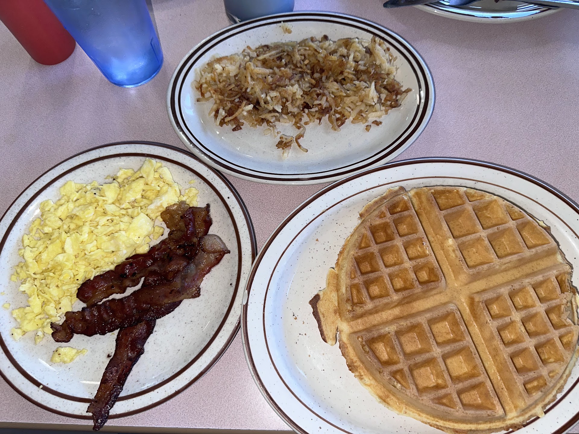 Our order was placed at 11:43am. Waitress never introduced herself but was friendly. My sons got the silver dollar pancakes with chocolate chips. One got bacon as a side and the other got sausage. I got the Belgian waffle special with 2 eggs and bacon. A couple minutes after ordering, I decided i wanted a side of hash-browns too. I was hoping the waitress would return prior to the food coming, but she didn’t and I just ordered it then.
