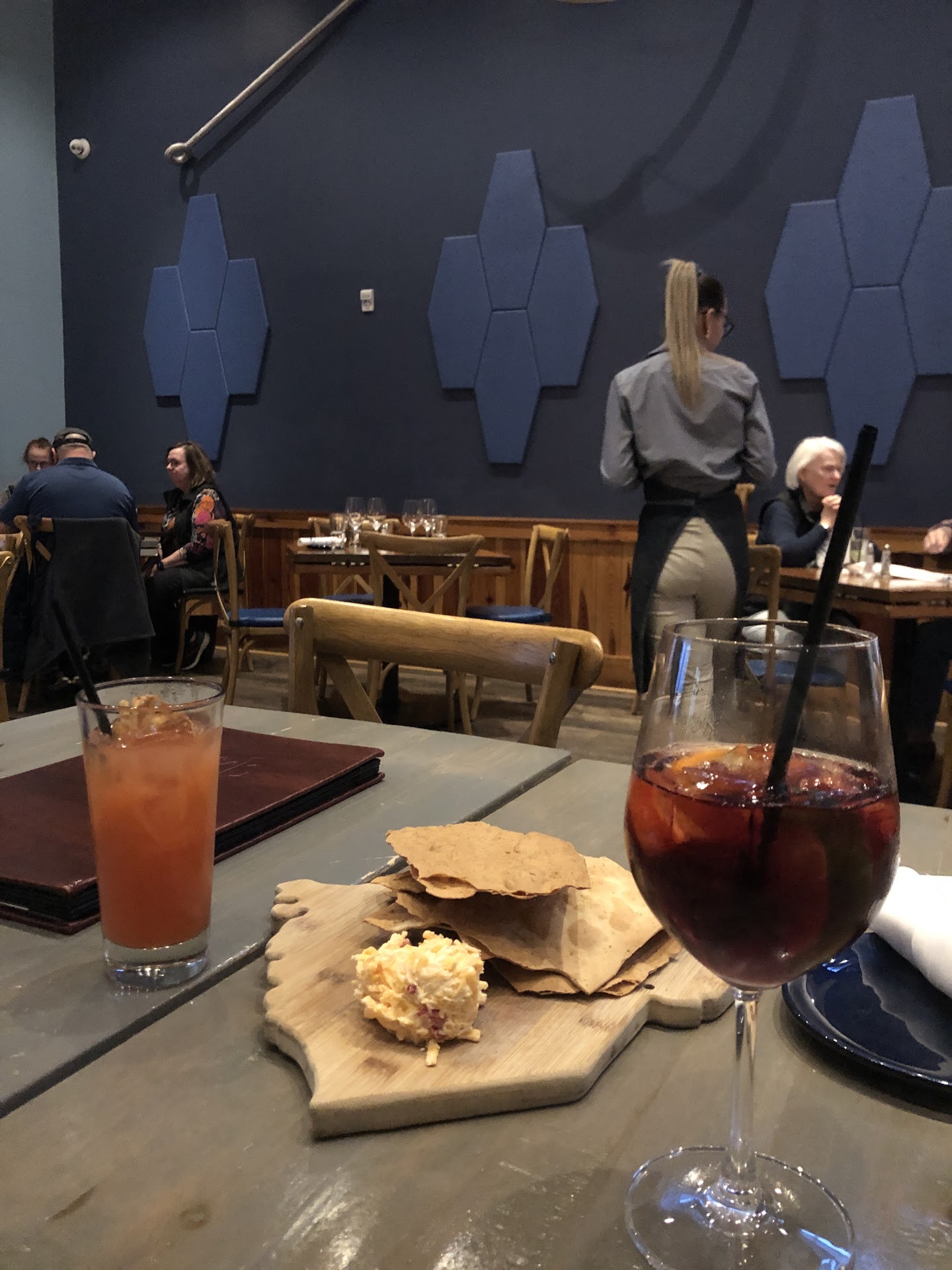We recieved a complimentary pimento cheese board, which was pretty good. For apps I got 4 oysters (great flavor and presentation) and the fish bites. Fish bites were light and full of flavor, a nice diversion from the abundance of callabash seafood in the area. The sauce it was served with was fantastic too - just the right amount of heat and acidity, but not too overwhelming. The cocktails were great too. I got the lazy alligator and it was the perfect sweet little treat I needed.
