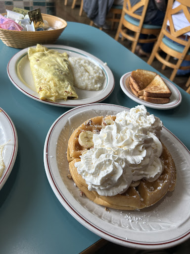 The omelettes are delicious, filling, and come with your choice of grits and toast OR pancakes included in the price so you get a decent little array for the money. If you like seafood - check out out Calabash Shrimp Omlette. They definitely don't skimp on the grilled shrimp and it goes well with the swiss cheeses flavor.
