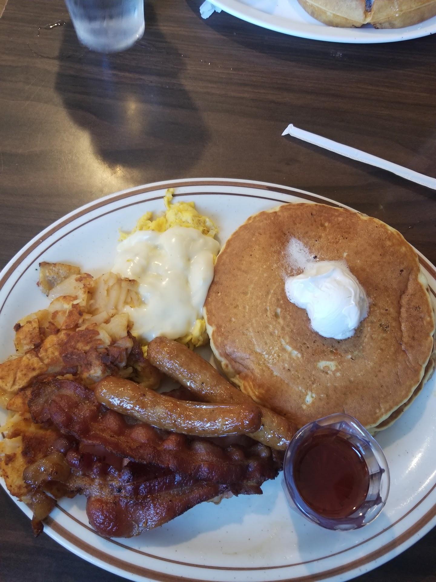 Ok...Let's get to the food. The menu is massive and it's also very eclectic. I mean the first time I came here one of the specials was a pistachio waffle. I knew then that was going to fall in over with this place. Today I got the grandslam breakfast because I just wanted a lot of meat. It comes with two eggs, bacon, sausage, ham and pancakes. Johnny D's was voted best waffle in SC by food network but their pancakes are nothing to sneeze at. The ham was soooooooooooooo good. I may have to order a side of it next time no matter what I get. My wife ordered the chicken and waffles. It was good but we've both definitely had better chicken and waffles. Not anything neither of us need to have again. What I did like was that the chicken was all white beast meat and not super breaded. Unfortunately it was not seasoned and couldn't really stand on its own. It needed to be paired with the waffle and syrup.