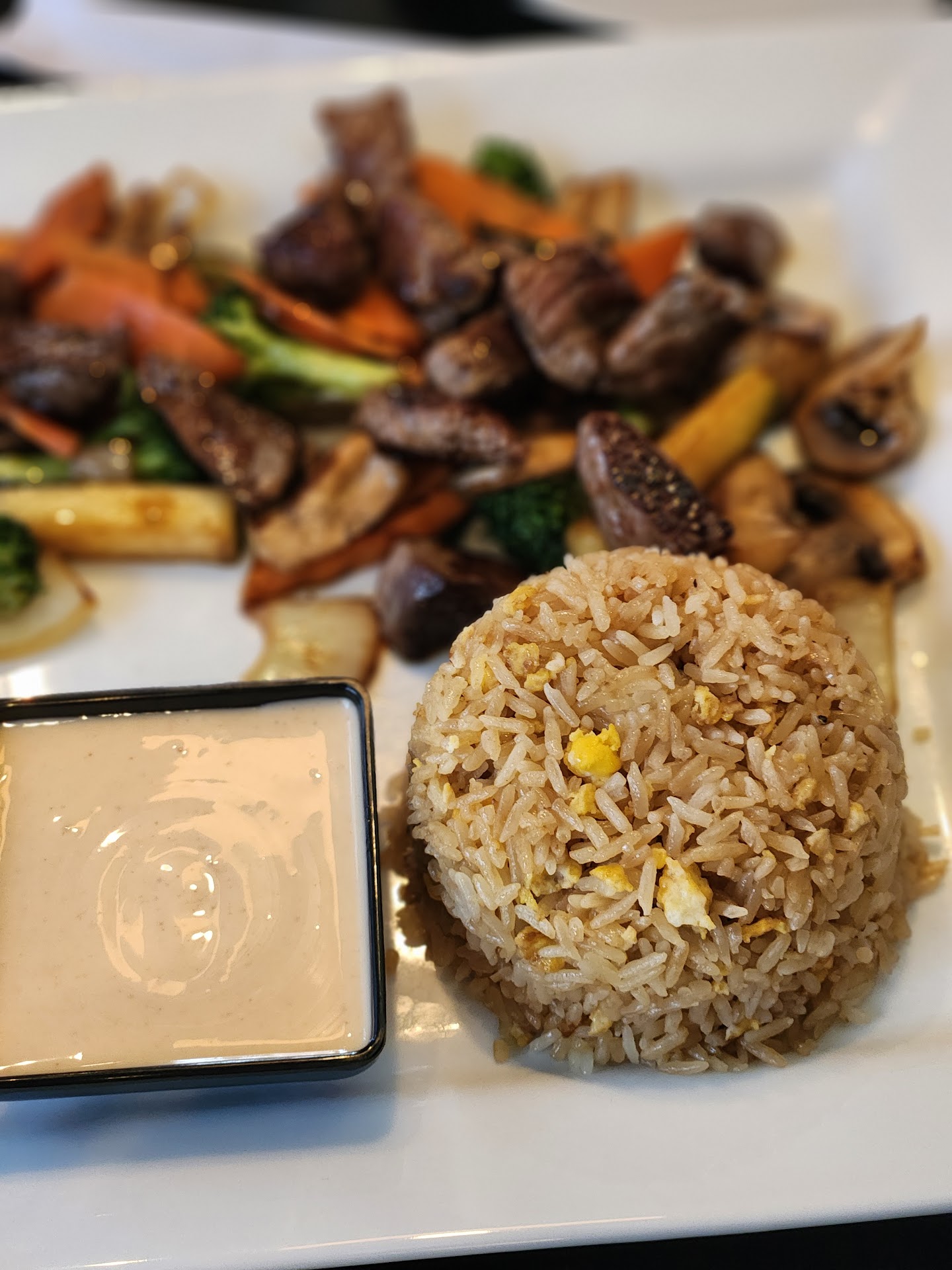 Food: The soup arrived first. Three of us ordered clear soup, along with the appetizer, and it was delicious. Very flavorful. The entrees arrived after about another 15 minutes. The portion sizes were good (3 of us got to-go boxes), the steak and chicken were succulent and flavorful. The hibachi comes with the following vegetables: carrots, mushrooms, broccoli, zucchini, and onions. The vegetables were very good. I really liked that the hibachi was not drenched in teriyaki sauce or the like to make up for lack of flavor like some restaurants do. None of the food was greasy like at some hibachi places. The rice was good as well and had eggs in it. The sushi was good (my first time!) and my friend who ordered sushi for her main dish also really enjoyed it. All of the food looked, and tasted, fresh.