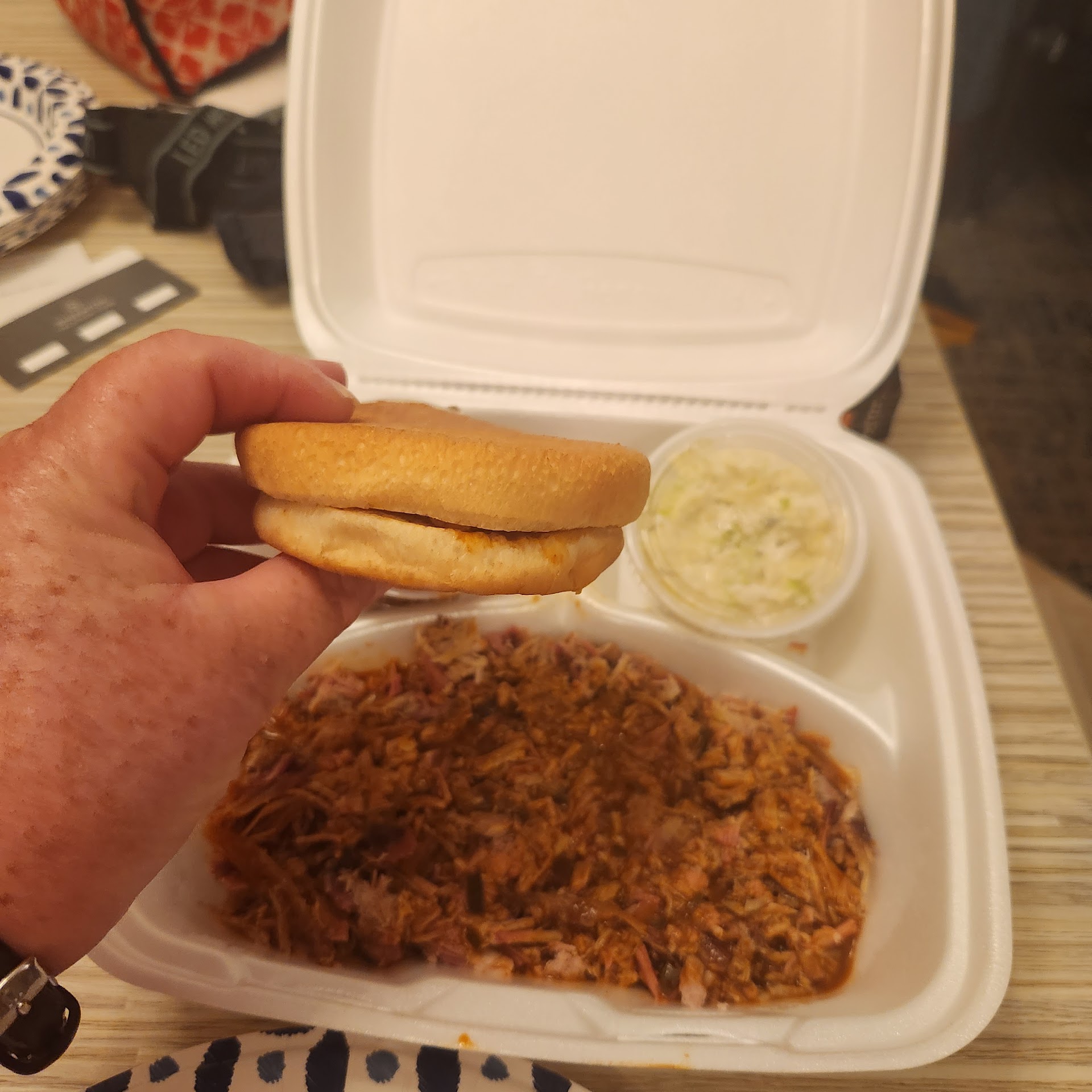 Read moreI don't know where to begin... From the second I pulled up in the parking lot it was not what I was hoping to see. Being it was my family's last night in Myrtle for vacation I was expecting a sit down restaurant with a wait staff and a table big enough to accommodate 12 or so of us but It truly is a hole in the wall BBQ joint. Since my cousin's didn't seem to balk upon walking in I thought, "If they don't mind then I won't be a snob about it and since there were several people already eating and a line forming behind our party I thought "there might be something to this place" The menu was reminiscent of the menu in the movie "My Cousin Vinny" Where it consisted of 3 options. "Breakfast" "Lunch" and "Dinner" It lacks options I would come to expect of any legitimate BBQ pitt. This is a one trick pony. Chopped pork is all that is on the menu that I would expect to see at a BBQ place. Albeit it is very good and I enjoyed my Jumbo Sandwich. I was just floored by the lack of options. No BBQ Chicken, No BBQ Turkey, No BBQ Beef ribs, No Brisket, No Ice, Just BBQ Pork. If you want a good Chopped Pork sandwich for lunch and don't mind cleaning your own table before you sit down then this place is great! I would not recommend coming here though with any more than...
