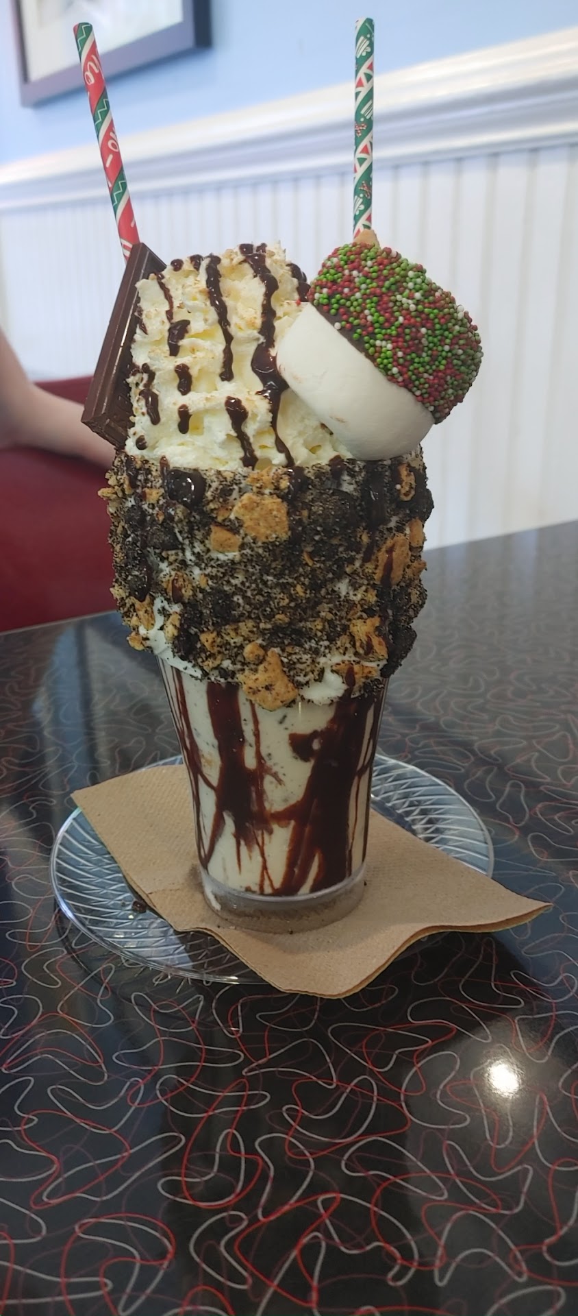 Read moreMy son ordered the Root Beer Float with two scoops of vanilla ice cream, and couldn't stop drinking it, and telling me how much he loved it. My wife ordered the S'mores Freakshake with Chocolate Chip Cookie Dough Ice Cream. It was then topped off with Hershey Chocolate Bar, graham cracker, chocolate dipped marshmallow and two straws. She couldn't stop raving about how delicious it was. Then she scraped off the side with all the chocolate and graham crackers. I ordered the Sammie with Turtle Tracks Ice Creams and two Chocolate Chip Cookies. That was so delicious. Cold ice cream sandwiched between two delicious cookies makes for a delicious dessert. We were waited on by a...