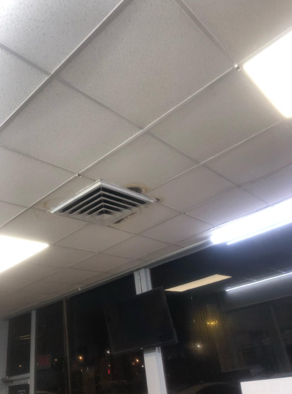 Also, fix the moldy ceiling tile that is above a dining table your PAYING customers are supposed to sit and eat it.
