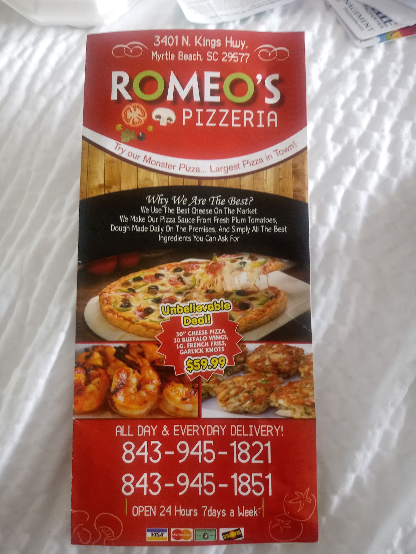 When I tried calling to let them know my order was wrong, I got no answer. According to the menu they are open 24hrs a day. But that menu is for ROMEO'S PIZZERIA..smh. So to be honest I would NOT recommend this place and due to the fact that I have been unable to get someone on the phone I have disputed...