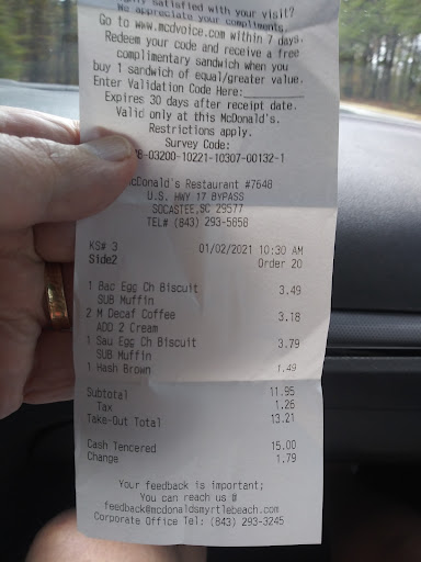 They're right up the road from my house so I can't help but go to this one. The next one after that is on the other side of market common and up the road by the waffle House and the other ones all the way in Surfside. But I need to start going to those other ones because this store just never gets anything right I've had problems with bacon I've had problems with getting my food just plain meat cheese only always give me a fully dressed sandwich always give me a piece of bacon broken in half and just a half. Always has an attitude I've had hair in my breakfast sandwiches twice. The district manager Irving Davy I've had to call more than one occasion on the store and looks like I have to call him again I got in line at 10:40 p.m. line wrapped so far around the building that it was actually in the street outside the parking lot by 11:20 I get to the speaker on their thing it says give us the code for your rewards first and then place your order it's written right there on their speaker I say my code is and she goes no you don't give me the code you give the cashier the code I said no ma'am it says on your speaker to give the code now because the new rewards program actually applies the coupon when I order by giving you this by giving you this code My card's actually saved into the app It'll automatically charge me and I just pull up to the window they can meet our seat and then I get my food and go. She says no just give me your order I said a large fry she says we're out of large fries I said we'll give me a basket of fries I give you a basket fries that's fine anything else I said I would like a hot fudge sundae is your machine working we don't do any ice cream after 11:00 and I said well I've been in line since 10:40 that's not fair I just sat here in line for that long for no reason cuz you don't have my large fry and you don't have the ice cream well sorry you wasted your time with an attitude just pull around so I pull around I pay the person at the window I get to her she hands me out my fries rudely and I said ma'am your new rewards works in a different way I'm supposed to give you this code first It says it right there on your speaker and she goes no you don't You give it to the cashier Now pull forward and just leave I said no I'm not going to pull forward and just leave with an attitude like that she slams the window in my face and then I sit there for a minute because I know the manager and I'm expecting him to come to the window they ignore me the other car is behind me honk so I pull off and then I get around the corner and the fries that they gave me for the fry basket weren't even cooked all the way And I sit there and I called them and I called them and I called them and I'm not about to get another hour long line so I will be speaking to Irving...