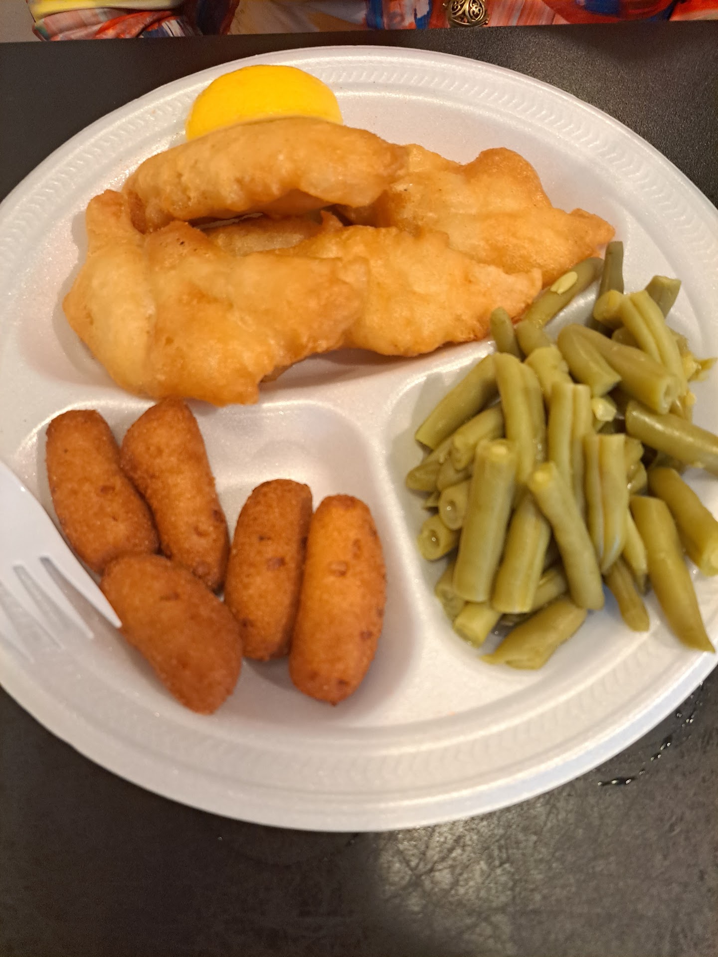 The green beans were obviously canned, but washed and with a little salt and pepper paired well. The hushpuppies were delightful and not overly greasy or salty. The coleslaw could've used some tlc as it was not creamy or flavorful at all.