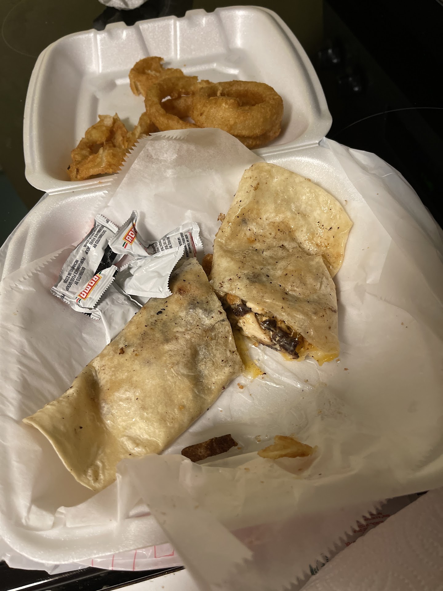 Let's start with the first thing you notice once you step into Pop's: the cigarette smoke. The cigarette smoke in there is visible and soaks through every fiber on your body. The ceiling tiles are all yellow as well. I would normally leave a bar or restaurant if it smelt that bad, but it was late, and we didn't have many options other than Pop's within walking distance from our rental. Had I read the 1 star reviews from numerous people, I wouldn't have trusted the quality of the 5 star reviews that come from their regulars/people who don't order food. So here's what happened - 4 of us got to Pop's and ordered at 9:47pm. We had a simple order of 1 cheeseburger, 1 chicken philly, 1 chicken quesadilla, and 1 order of onion rings. We stayed because the bartender said it'd be a reasonable 20-25 minutes. 10:30pm rolls around, and we start getting curious about where the food is. The bartender sees this and tells us that they are working on it and the cook is "only one person". She said it wouldn't be much longer, and that they had an order before us. We listened to karaoke as we waited more. Time kept passing without any indication that our food was coming. Then 2 bags of food get to the window, and we assume it's ours. Nope. Apparently an employee was getting that food. So we ask around 11 how much longer we should expect. Bartender says that the cook is boxing it up right now. Well, you guessed it, he was not. We tell her that the 25 minute estimate was fine, but we are almost at 1.5 hours. The bartender then says that the cook is "a little slow" in a tone that didn't seem to convey the speed to which he works, but rather his mental state. The way she acted towards us and him was very rude and out of line. Either she knew the cook was slow and quoted us something totally off base, or she was trying to make us drop the complaints by saying there was a mental deficiency. We said we would have understood if the wait was that long, but we were justifiably upset that we had been in there 3x the amount of time we were quoted without any hint of food incoming. Her response was that the cook was "literally boxing it up right now" and that the cook boxed up the wrong food, but they are working on it. 5-6 dine in orders come out of the window and get delivered to a table that had been there longer than us. 15 more minutes and she offers a refund that she never actually gave us because the cook was once again "literally boxing it up right now". At this point, we were so fed up with the hostile bartender, the long wait, and the smoke inside the place. I decide to ask the 2 women sitting in front of us at the bar how long their food took. They agreed that it was about an hour, but they were drinking, so the time didn't bother them. They asked our situation, which we explained. We told them we were about to leave and not even bother to ask again for the refund. If the food magically came out, it would be theirs. One of the ladies (it was her birthday the next day) offered us $40 for the food so we didn't leave empty handed. We declined that, but thanked her for being so sweet while they were also on vacation. While we were talking, the food finally came up in the window (at 11:46pm) from a surprise new cook. With that, we were off to see if the food was edible. Shocker...it was not. See the photos below to get a better idea. The cheeseburger was rock hard, the chicken quesadilla either had burnt tortilla or mushrooms in it, the onion rings were falling apart and sitting in grease, and the fries were flavorless. The chicken philly was the only somewhat edible food.