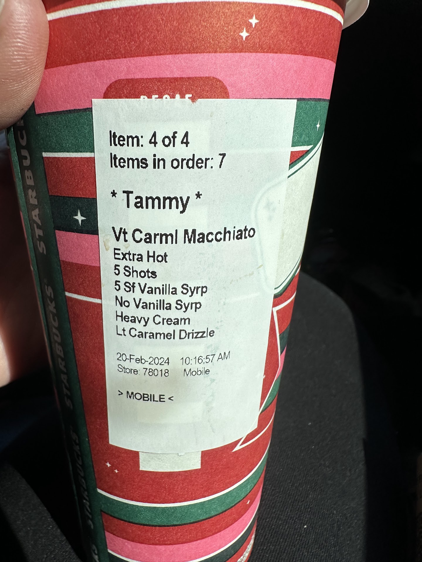 Ā Ā Ā Read moreWent to this Starbucks this morning while on vacation. Waited 40+ minutes for one of my two drinks while they cranked out mobile order after mobile order. Baristas are working their butts off but order of operations is absolutely terrible. My second drink wasnāt even up to be prepared because mobile stickers were on cups and seemed to take priority. I asked for a status update on my iced drink and the manager said the drinks were coming from two different areas. I told him my wifeās hot drink would be cold and that I had already been waiting over 30 minutes. He took all the stickers off the cups that the barista prepared and put mine first calling out āsorry I had to do that but we need to put JENNIFER FIRSTā which was seriously embarrassing. I wish I couldāve apologized to the girl standing at the end making the drinks. They need a different system. We would not go back unless we had a mobile order placed and alter humiliating me I would hesitate to go...