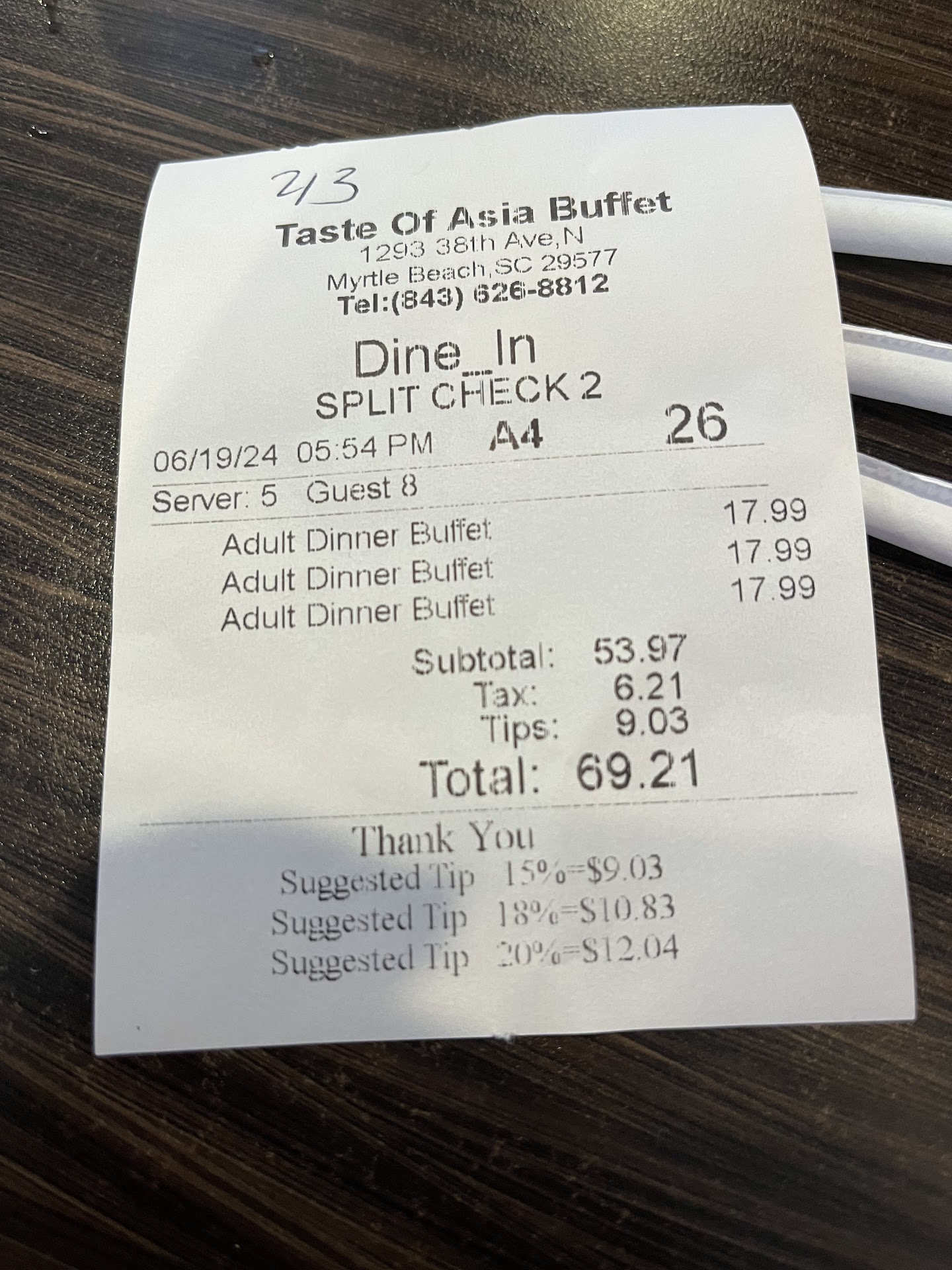 please read I contemplated posting this but I want people to be aware of the uncomfortable encounter I experienced at Taste of Asia in MB yesterday. My sister and I stopped for lunch- the food selection was okay and seemed fresh enough. Nothing to knock our socks off but okay so we dined in. At first glance I thought it was strange that the waitress would follow us to the buffet line seemingly monitoring the food we selected, but I didn’t say anything because I was eating everything I selected - not like we were wasting food. Multiple times she would come and stand by our table and it felt like she was trying to listen to our conversation. Again, we brushed it off, the check came and I paid with my credit card, but I have been taught to only leave tips in cash so they aren’t taxed, so I wrote CASH in the tip line, paid the bill, was getting into my purse to pull out cash for the tip and while doing this my sister who was my lunch date, stood up and started gathering her things because we were leaving. As I went to place the money on the table and stand up (we were not even remotely walking out) the waitress came over to my sister and raised her voice (the language barrier made it hard to understand) but I made out “Tip Tip Tip” my sister said “yes she is getting it out” and the waitress like cornered us and was looking into my purse asking me how much we were tipping. It was so uncomfortable and she kept yelling. I said yes I am laying it on the table? The waitress shook her head and said “Tip Tip Tip” - I waved the money so she could see I had it and she took it from me and finally left us leave. I was humiliated and also felt like I had been robbed- I gave her a $20 mistakenly when my bill was only $30 total, but I was so disoriented and flustered that I didn’t care and just wanted out of there. Please beware, something is very very off and we will...