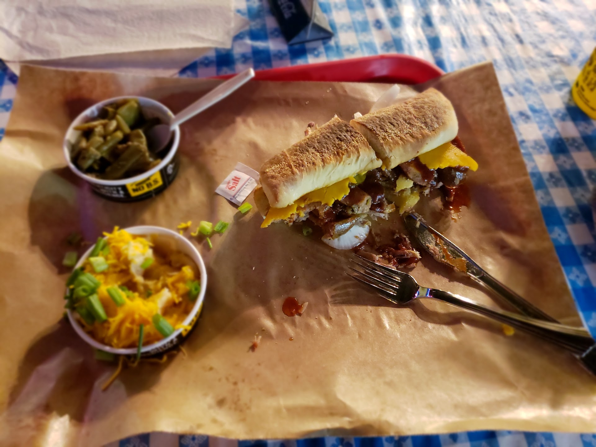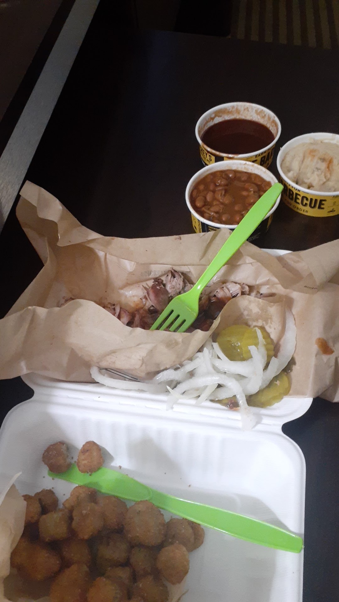 Read moreSmoky as we were driving by, and our curiosity got us, did a U turn follow the smoke The first time ever that I pulled out Google to see reviews and recommendations on what to order. Brisket with mac & cheese, fried okra Gentleman let us sample his meats so we could decide on lean or fat and we chose thin layer of cardiac arrest brisket 🤣 Cooked to perfection, someone recommended fried okra and I'm glad I listened... hear, hear! If you have never liked okra for whatever reason, you'll love it now. Fried awesomely perfect, bite size, crunchy, not slimy little taters ..so gûd😋😋😋 you'll want to pop a few orders of these. Place is attached to a gas station, a bit old but cozy. Staff is beyond friendly maybe let go of the plastic tablecloth as it kept sticking to our arms and just go...