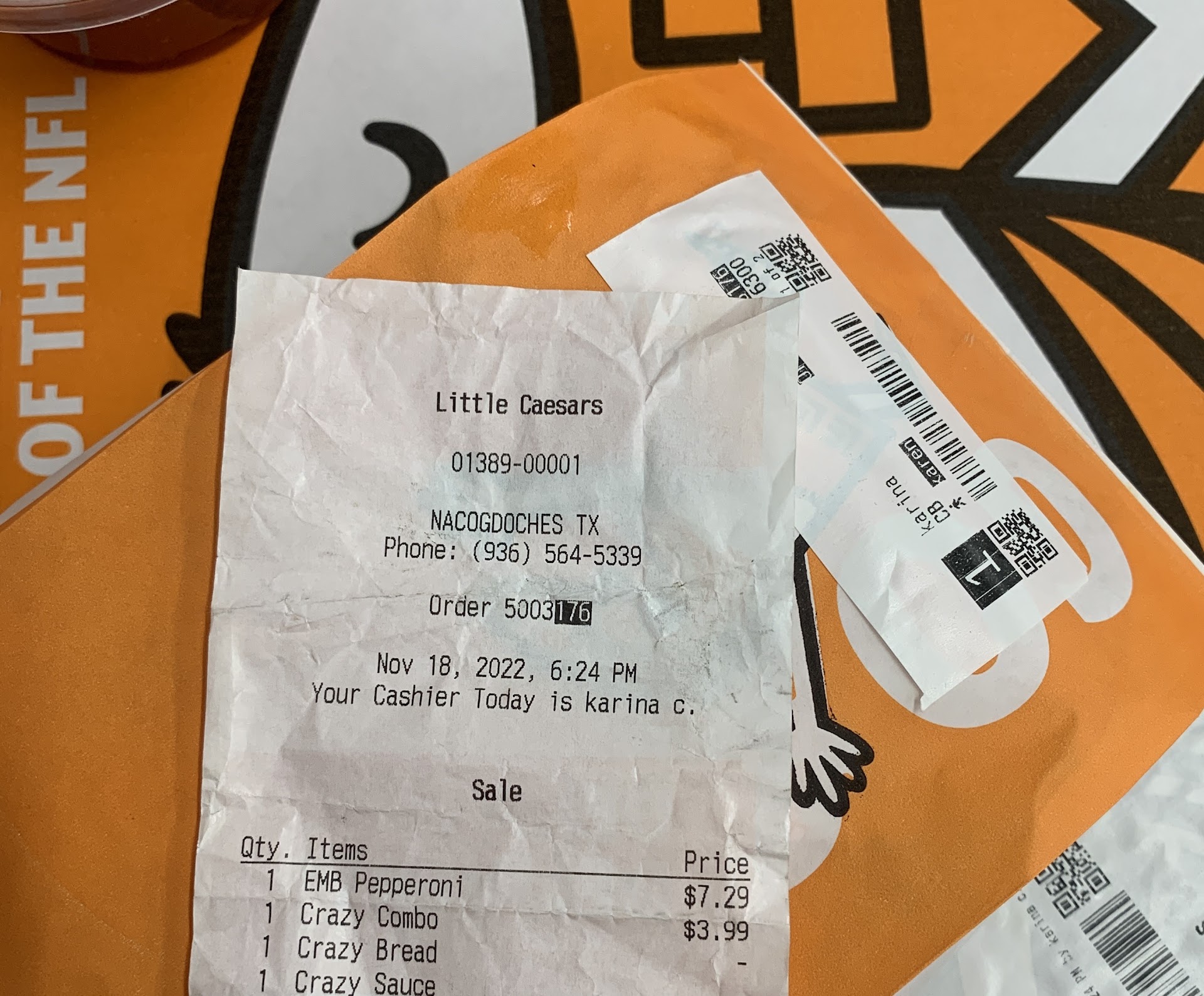 Read moreI don't have a clue what all these people are talking about? They must be payed employee's to be talking good about this pizza.Their is somthing wrong with the ingredients they use.Every pizza i have ever bought from LC.After a hour of setting on the counter turns a discolored orange and puke yellow color.The bread becomes hard in about the same amount of time.Pizza Hut Papa Johns Dominos.None of their pizza does that.Their somthing wrong with their pizza.And to be honest in my opinion it taste disgusting.I think it is no telling how long them pizzas set in a heat box all day.There is a reason things are cheap.Beware of Little Cesars in Nacogdoches Tx.The last time i ate one.I was sick for 3 days straight.Never again will ever eat at a Little...