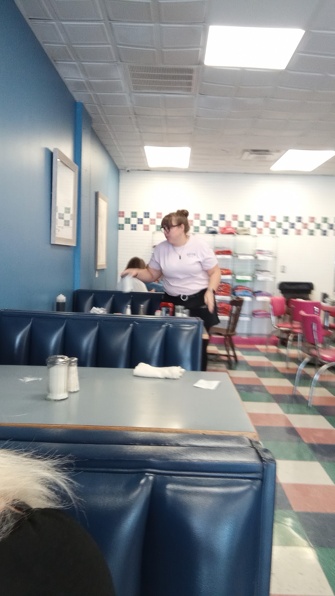 Visited Grits Grill twice during our 4-day OBX vacation. First visit was good. Only waited 10 minutes to be seated. Food was good, seating accommodations good and our waitress, Anna, was excellent. Did notice a little bit of water staining on the overhead tiles but no biggie. Second visit on a Saturday morning was a little bit different. Had to wait 45 minutes for seating which was OK but restaurant was extremely crowded. Our waitress, Angela, was very nice. waited a little bit longer for food and when it came, was OK. Although, one from my party ordered pancakes and said that they were bland. The biggest complaint, were the FLIES!!!!! They were everywhere!!! The only thing I could think is that they moved the hostess station outside near the entrance and there was a trashcan really close to the entrance. Also the floors were unkept. There was food from previous customers remaining on the floor after they left. The manager had to tell one of the staff to go sweep the floor under one of the tables. That should have been noticed by the staff person immediately after bussing the table as it was the same person bussing and sweeping. Also worth noting, the bathroom and the kitchen had the same entryway. And the bathroom is a unisex bathroom being shared by men and women. There was a line waiting at the bathroom/kitchen entryway that spilled over into the dining area. My husband has refused to return until the fly issue is resolved, the floors are stripped and resurfaced or mopped with bleach. That only requires moving the trashcan away from the entrance.Also wanted to note that the hostess, Alex, was very...