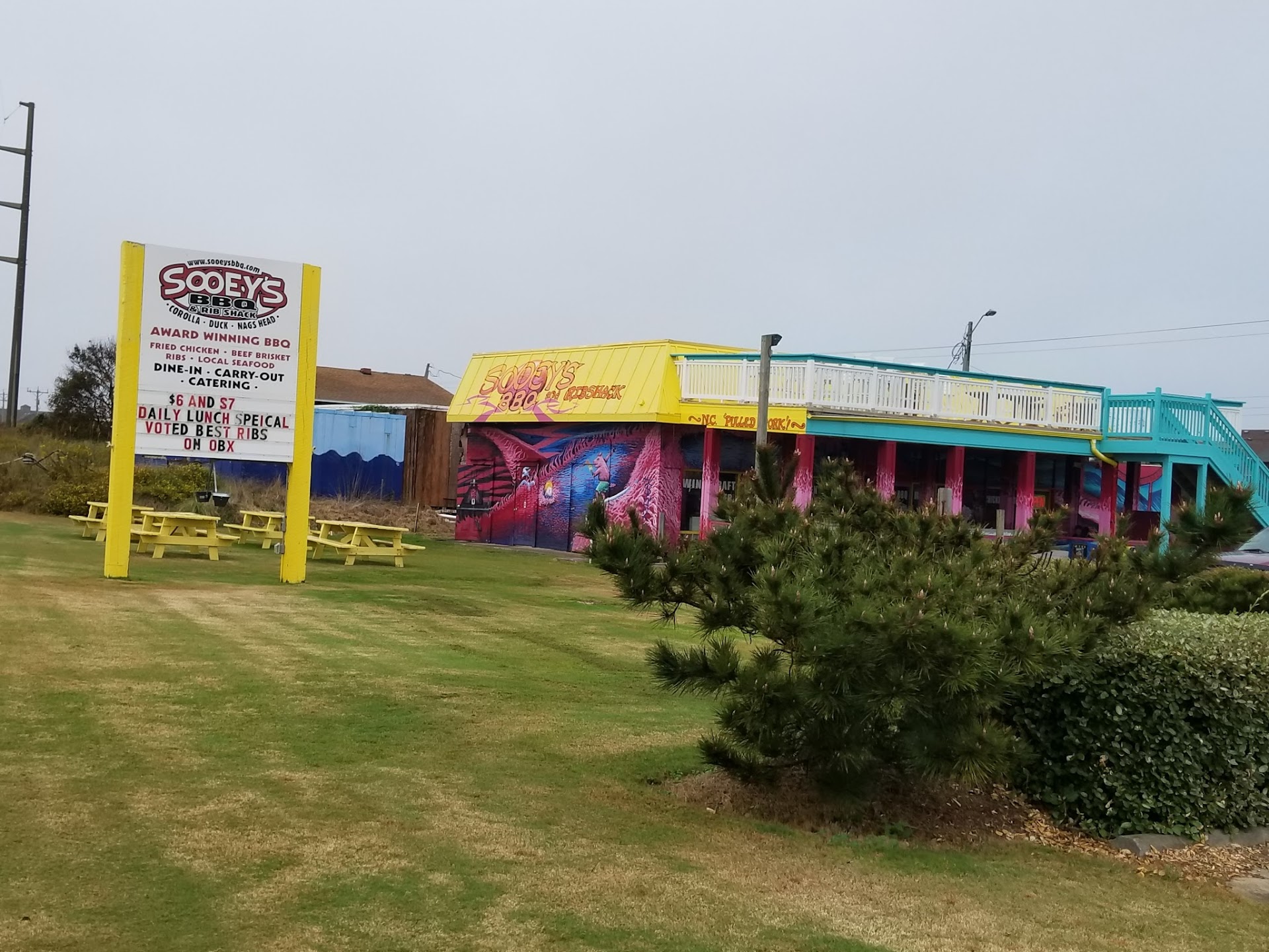 Read moreOUTSTANDING BBQ and Ribs on the OBX! Sooey's is not a chain and it's not big, but it's the real deal as far as NC BBQ goes. Yep, you're going to want a lot of fresh seafood when you vacay at the Outer Banks, but you're gonna want a break from all the tuna and clams if you're there for more than a few days, and it's good to remember not only that you're at the beach, but you're at the beach in NC where they have the best BBQ in the world. And I'm ranking Sooey's Best at the Beach. It's a small establishment around MP 12.5 or so, near where the Beach Rd. (NC12) and the Bypass (US158) come together. All the soulful sides you'd expect (beans, greens, slaw, taters), generous portion sizes for sandwiches and platters, good value for the money. Parking is free and outside dining is available. And the BBQ is NC-style vinegar-based DELICIOSO. Hush puppies are good and home made also. You're gonna want to think about getting some brisket to go so you can put it in a cooler and enjoy when you're back where you came from. (If you're local, I think they do catering as well). Not a spot to miss during your...